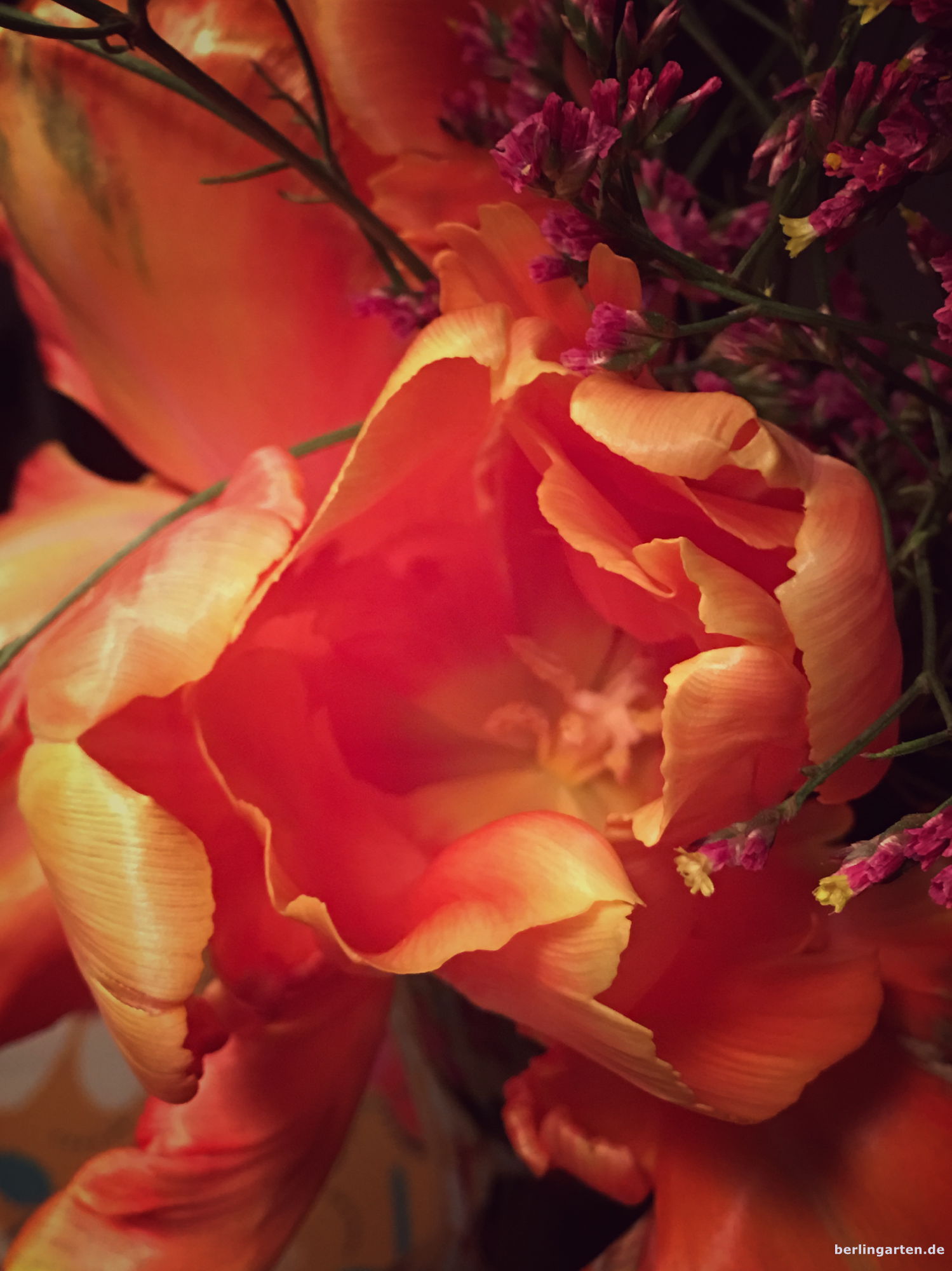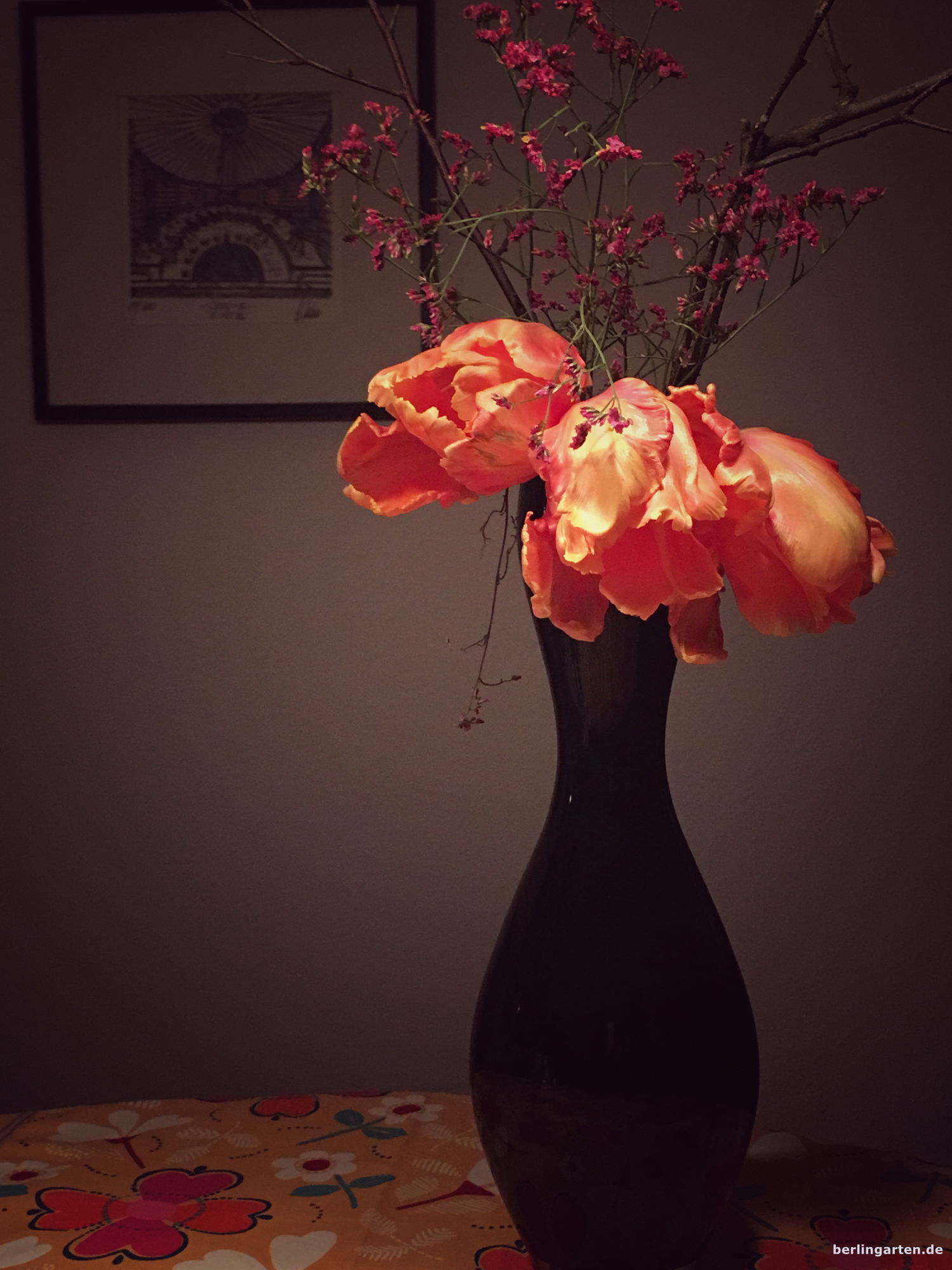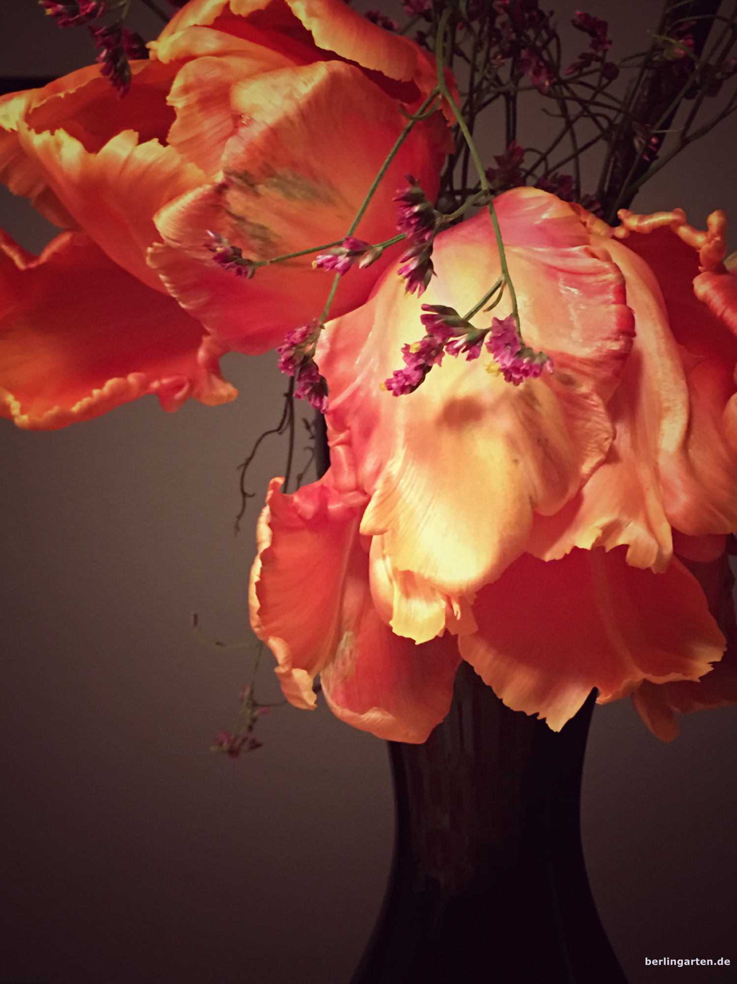 Selten hatte ich so schöne Tulpen wie diese: tiefes Orange mit einem Hauch von Pink, seidige Textur, barocke Formen und sooo lange Beine. Ich steckte diese französischen Papageientulpen mit etwas Statice als Spitze in eine 50 cm hohe schwarze taillierte Vase – und los ging die Show. Meine Schönen räkelten sich kokett aus dem Gefäß wie Dita von Teese aus ihrer Corsage. Ein heißer Look für ein Party-Buffet.