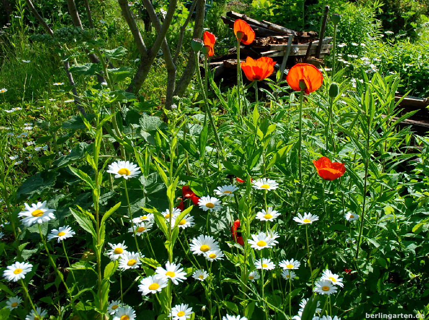 Die letzten Akeleien tanzen, der Mohn erinnert dich an Kindertage barfuß am Feldweg. Gut, dass sich Margeriten dazu versamt haben. Dieses Weiß! Du staunst, wie emsig das Gartenrotschwanzpärchen seinen Nachwuchs versorgt. Jede Minute ein neuer, oftmals waghalsiger Anflug.