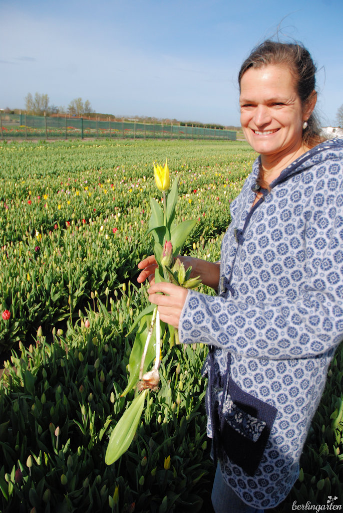 Einen anderen Weg geht Annemieke von pluktuín in Hillegom. Auf 3.000 qm kultiviert sie eine sortenreiche Mischung aus Tulpen zum Selberpflücken und im Sommer bunte Einjährige. Dabei geht sie konsequent ökologisch vor. Ihre Ware verkauft sie an anspruchsvolle Gastronomen und auf dem Biomarkt. Und obwohl Hillegom ein winziges Nest ist, kommen an dem Montagmorgen, an dem wir sie besuchen, eine Menge an Leuten zum Selberpflücken. Auch wir dürfen durch das Feld streifen und uns einen Strauß zusammenzustellen – ein Genuss, den ich mir auf Schnittblumenfeldern jetzt öfter gönnen werde. Denn frischer und sinnlicher geht’s nicht. Überdies sind die Freilandtulpen, die einfach aus der Zwiebel gezupft werden, deutlich größer und kräftiger als die Ware aus dem Gewächshaus.