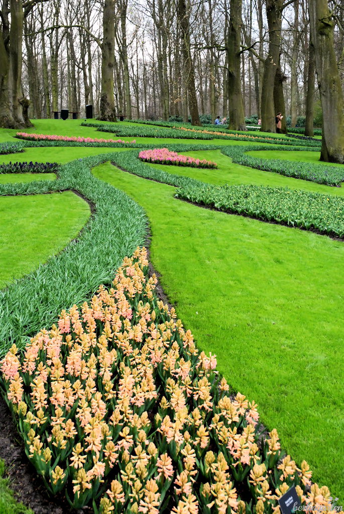Der Keukenhof in Lisse ist das Mekka aller Blumenliebhaber und ich bin glücklich, diese Attraktion nun auch einmal erlebt zu haben. Interessant ist, dass der Keukenhof, obwohl er nach Disneyland in Paris der besucherstärkste Park Europas ist, eigentlich gar nicht als Touristen-Bespaßung gedacht war: Der Keukenhof ist in seiner Intention seit 70 Jahren die große Leistungsschau der holländischen Blumenzüchter, die auf dem 4,5 Hektar großen Park neben Schloss Keukenhof den Einkäufern ihre besten Auslesen präsentieren. Daher hat der Keukenhof auch nur zwei Monate lang während der Blütezeit geöffnet – heuer noch bis zum 13. Mai. Bis dahin werden die bis zu 67.000 Besucher am Tag rund 7 Millionen Blumenzwiebel-Pflanzen bewundern können. Diese unglaubliche Menge an Zwiebeln werden jeden Herbst von nur 40 Gärtnern in Handarbeit gesetzt. Und ich bilde mir schon etwas darauf ein, wenn ich jeden Herbst ein paar hundert bis tausend versenke…
