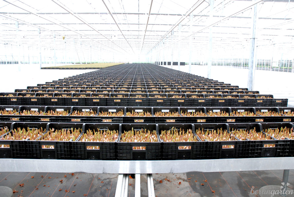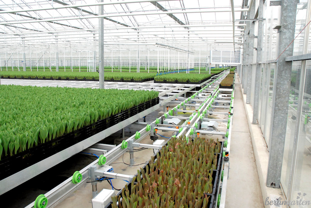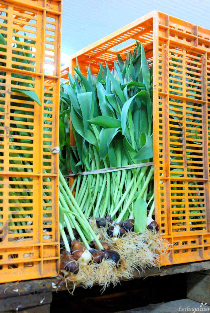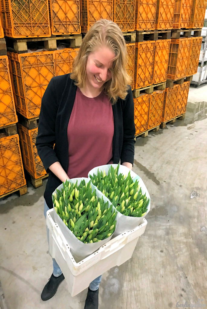 Wir sind verabredet mit Nienke. Sie arbeitet im Tulpenbetrieb Zwettulips in Rijsenhout und zeigt uns den Weg von der angelieferten Tulpenzwiebel bis zur fertigen Schnittblume. Da Zwiebeln einen Kältereiz benötigen, um Blüten zu bilden, wurden die Zwiebeln vom Züchter bereits dem Frost ausgesetzt. Bei Zwettulips werden sie dann bei 2 Grad im dunklen Kühlhaus erdfrei in Plastikkörben so lange gelagert, bis sie an der Reihe sind, den Wachstumsprozess zu starten. Bei 15 Grad gedeihen sie optimal und fahren vollautomatisch durch die Glashäuser, bis sie nach rund fünf Wochen soweit sind, geernet zu werden. „Pflücken“ bei Tulpen bedeutet am Ende nur das Entfernen der Zwiebeln, die auf dem Kompost landen. Nienke ist von nachhaltiger Produktion sehr angetan und freut sich, dass speziell die Tulpenproduktion eine gute Ökobilanz aufweist: Tulpen lieben es kalt und brauchen im Vergleich zu Rosen oder gar Orchideen sehr wenig Energie.
