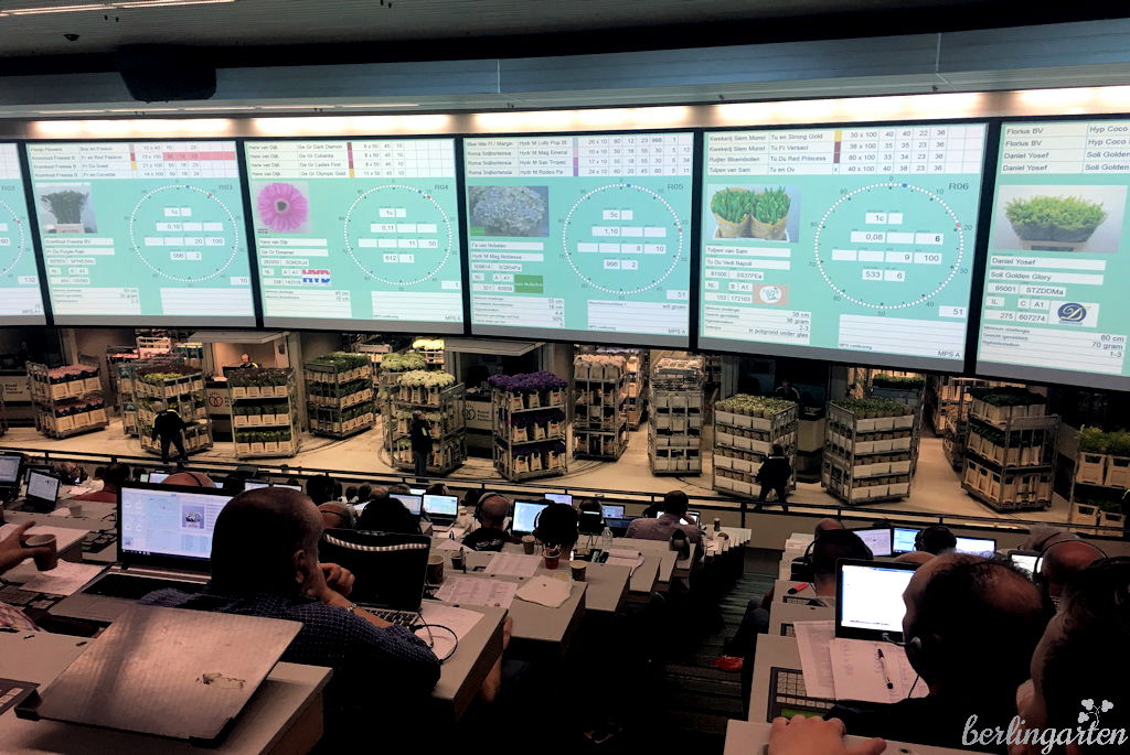 Linda ist Auktionatorin und zeigt uns, wie die Blumen unter den digitalen Hammer kommen. Ich durfte eine Stunde lang mit im Auktionatorhäuschen sitzen und war beeindruckt von dem schnellen Geschäft. Gar nicht mal so leicht zu entscheiden, wann man zuschlagen soll, wenn wenige Sekunden später die Ware pro Stiel vielleicht 10 Cent weniger kostet und man sich mehrere tausend Stück in den Warenkorb packen will.