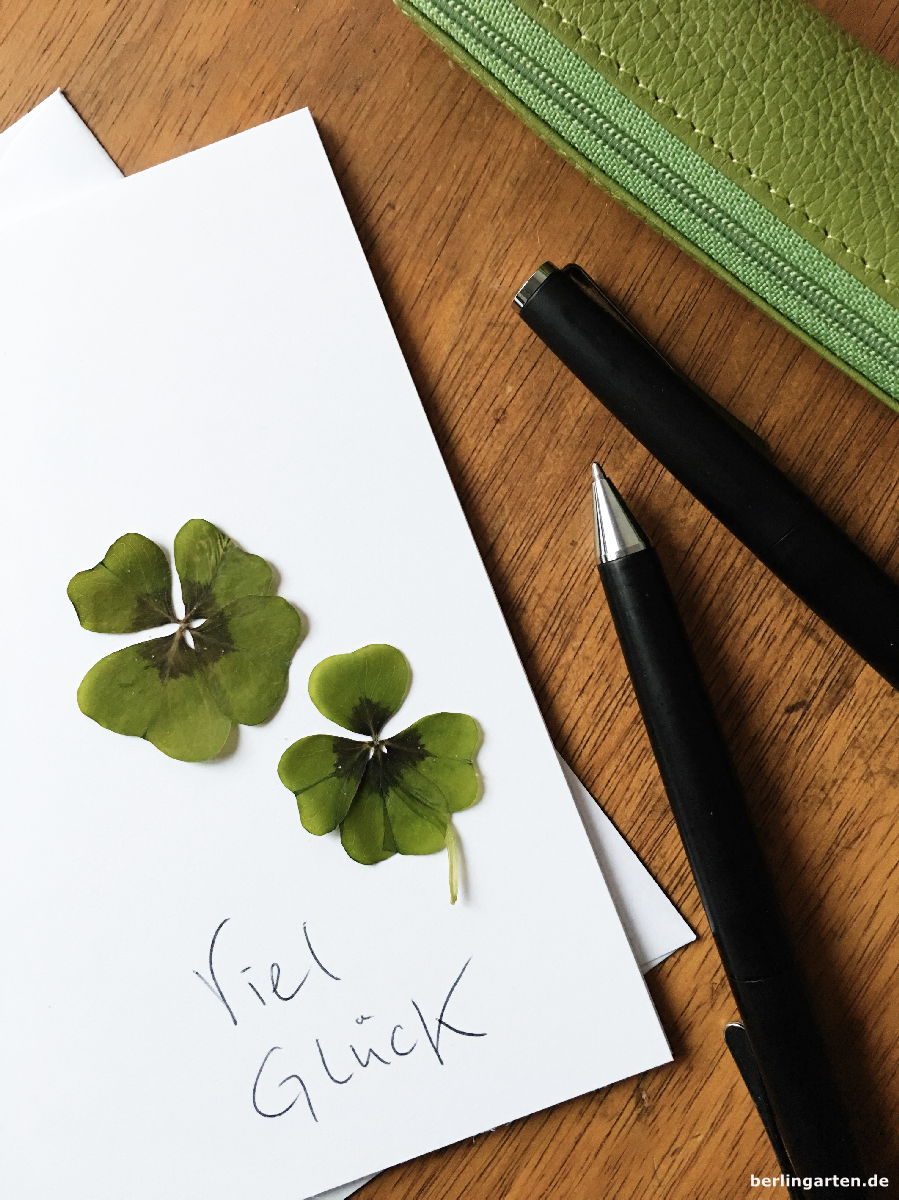 Die vierblättrigen Kleeblätter abschneiden, klassischerweise vorsichtig auf Zeitungspapier ausbreiten, zuklappen und beschweren – tja Telefonbücher gibt’s nicht mehr, jetzt könnte ein schickes Table Book als Presse herhalten. Nach zehn Tagen ist alles fertig getrocknet. Kartenrohlinge gibt es im Schreibwarenbedarf, auf die du die Blättchen nur noch aufkleben musst. Ich nehme Pritstift dazu.