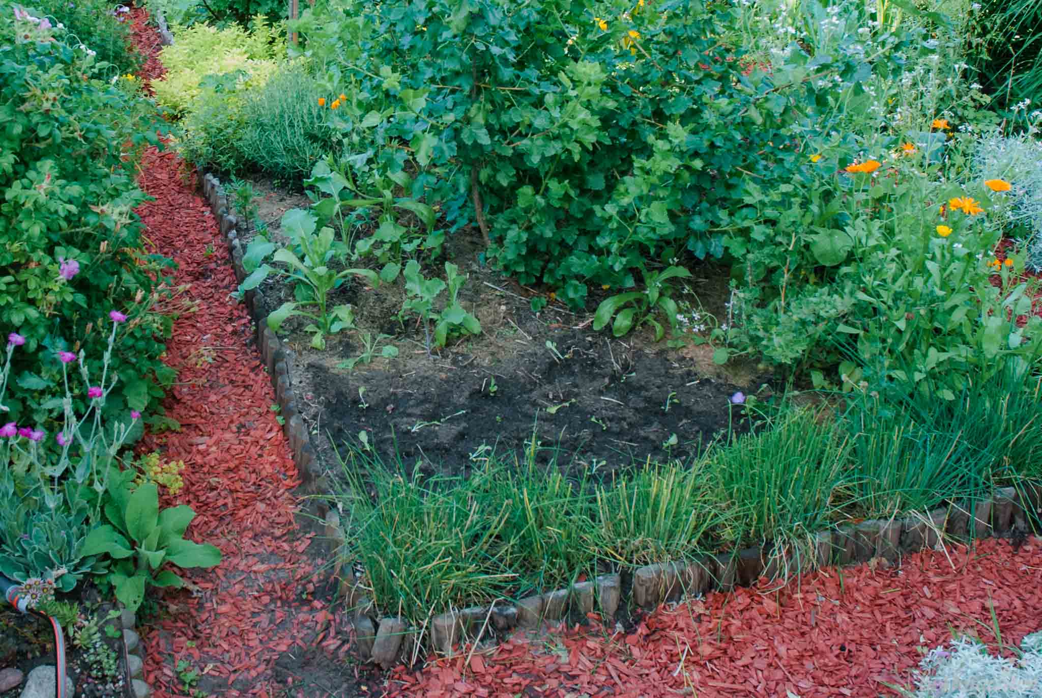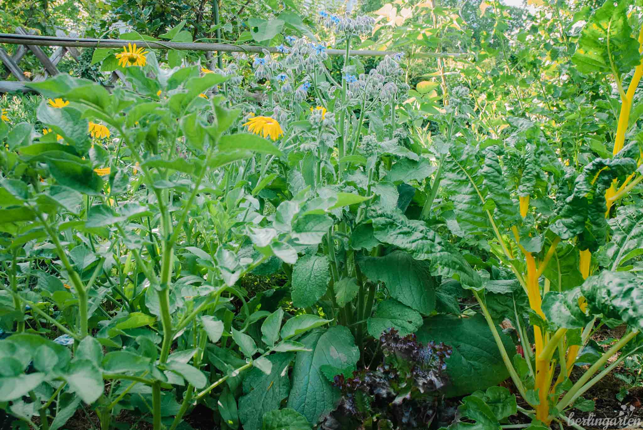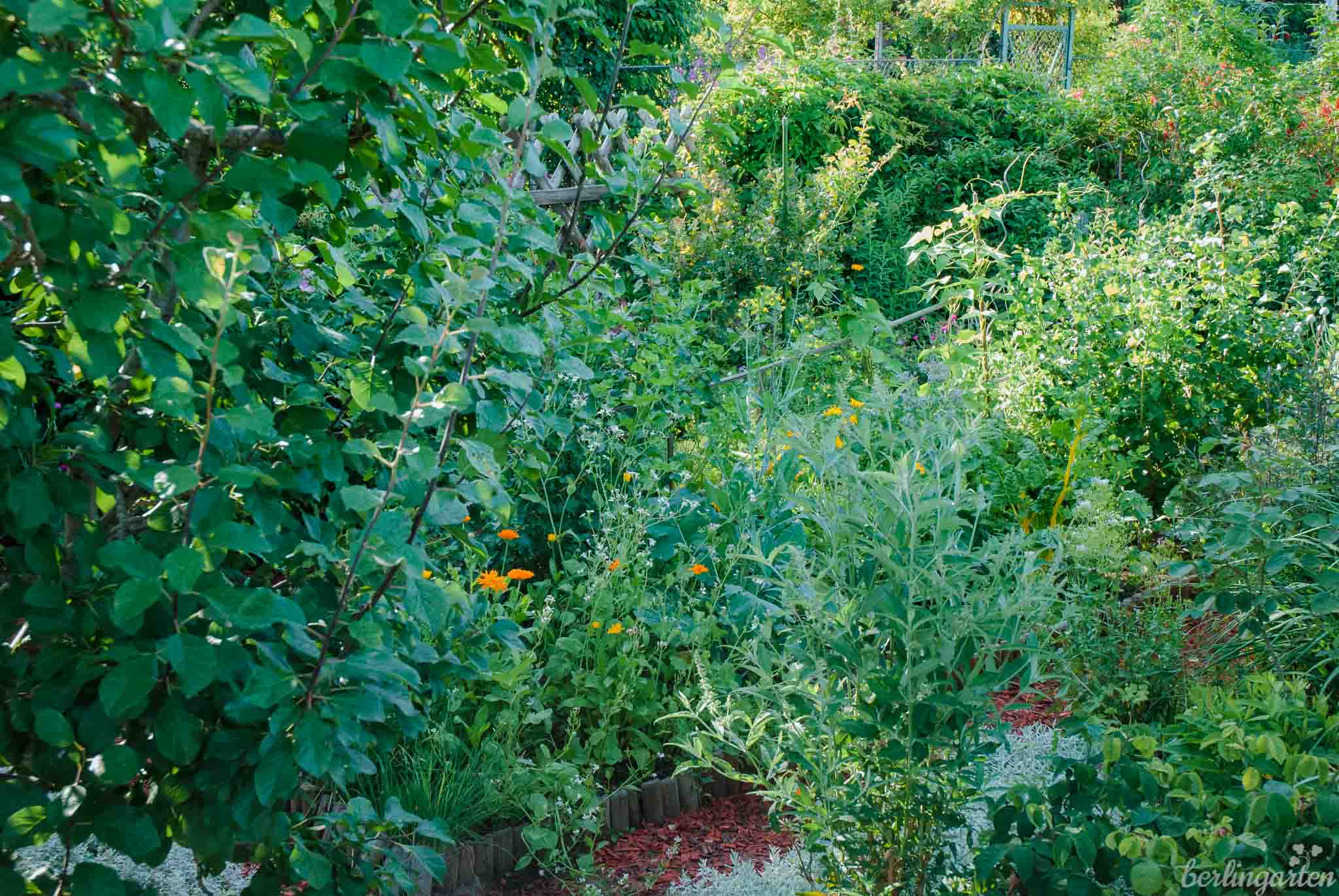 Dass der Plan aufgegangen ist, möchte ich dir heute zeigen. Es ist viel los im Küchengarten, es summt und brummt, alles wächst wie verrückt und dennoch findet am Ende jede Pflanze ihren Platz. Seit ich eine Dynamische Agroförsterin bin, weiß ich auch, warum es trotz der Enge im Garten so großartig gedeiht: Die Pflanzen stören sich nicht, sie unterstützen sich gegenseitig: über und unter der Erde. Nicht von ungefähr gibt es im DAF die ‚magischen Prinzipien‘ große Vielfalt und hohe Dichte. Und da, wo es doch mal zu viel Konkurrenz geben sollte, kommt eingreifendes Schneiden als drittes Prinzip dazu.