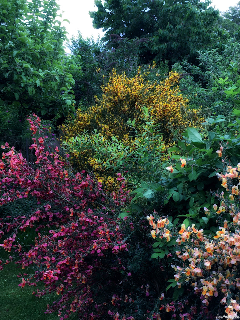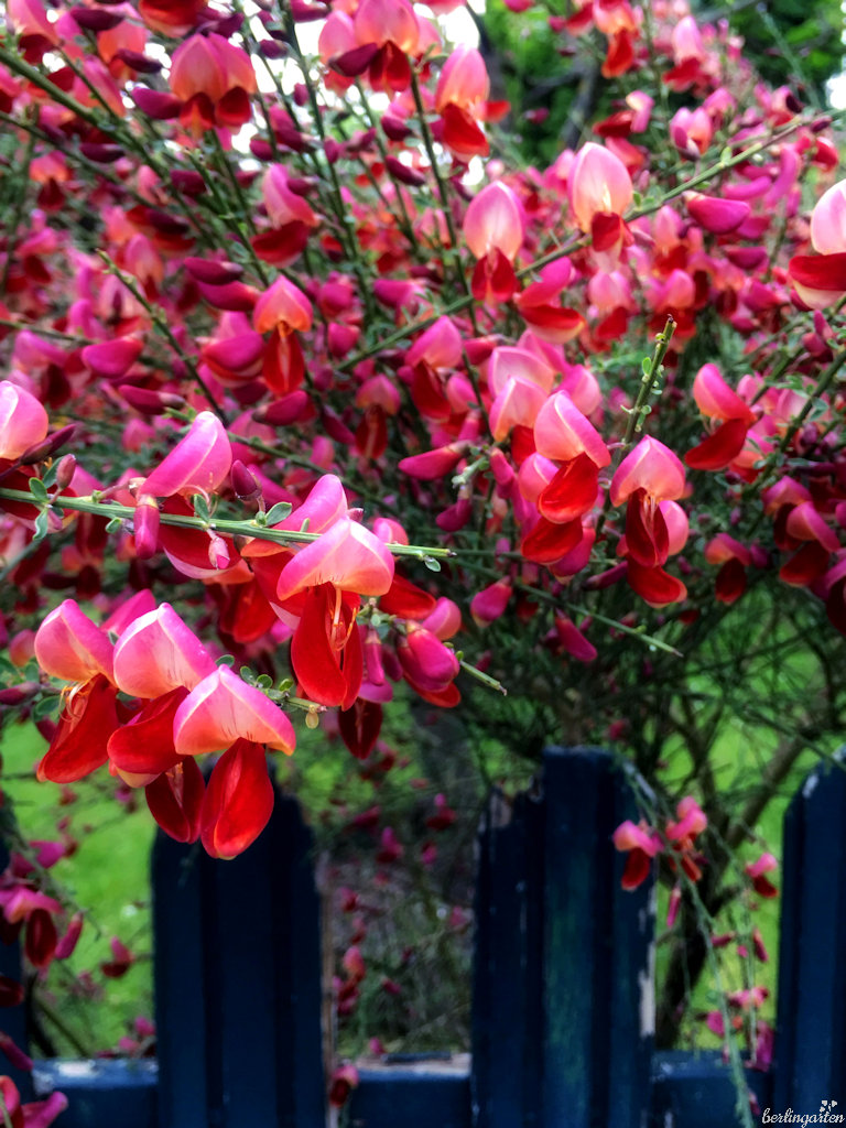 Toll sehen besonders die drei zusammengepflanzten Sträucher aus. Je sonniger der Standort ist, umso intensiver wird die Färbung der Blüten. Der Besenginster kommt nämlich ursprünglich aus dem Mittelmeerraum, Teilen Afrikas und dem westlichen Asien. Bei uns sieht er toll aus in Solostellung, gemischten Rabatten mit Stauden und Gräsern, Heide- oder Steingärten. Wenn du dafür sorgst, dass er genügend Licht bekommt, passt er auch in eine Hecke aus Blühsträuchern. Das finden dann nicht nur Spaziergänger wie ich, sondern auch Vögel attraktiv.