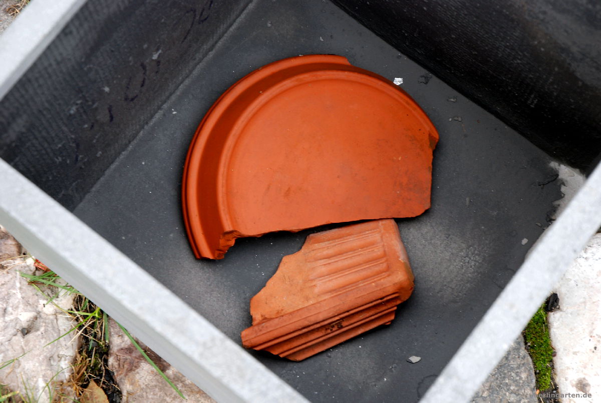 Nach den guten Erfahrungen habe ich nun noch eine Schippe draufgelegt und ein größeres Gefäß nachhaltig bepflanzt. Da Tontöpfe nur bedingt frostfest sind und auch irgendwann durch Kalkablagerungen unansehnlich werden, habe ich mich für einen Kübel aus Fiberglas entschieden. Er sieht aus wie Beton oder Blei, ist aber ganz leicht und dennoch über Jahre haltbar. Man kauft diese Gefäße in der Regel ohne Bodenlöcher, so dass man sie auch für den Innenbereich oder als Miniteich nutzen könnte. Bei uns soll der Topf aber draußen wohnen, sodass ich Abflusslöcher gebohrt habe, die überschüssiges Wasser abfließen lassen.