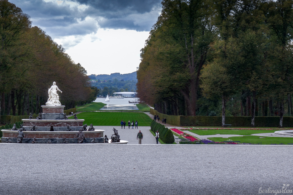 Barock ist auch der Garten. 120 x 240 Meter misst die von Hofgartendirektor Carl von Effner geplante Anlage, die 1882 begonnen wurde. Stilbildend ist das „Parterre d’eau“, das aus zwei großen Bassins mit den Figuren der Ruhmens- und Glücksgöttinnen Fama und Fortuna besteht. Überdies gibt es einen Latona-Brunnen mit Blumenparterres – auch hier lässt Versailles grüßen. Der „Grand Canal“ führt den Blick vom Schloss herunter Richtung Chiemsee. Bei abendlicher Beleuchtung muss es großartig wirken. Der Garten war auch damals schon elektrifiziert – eine Weltneuheit.