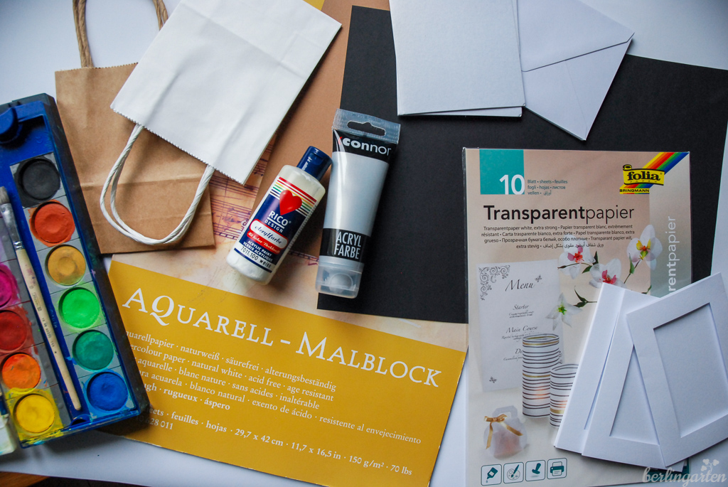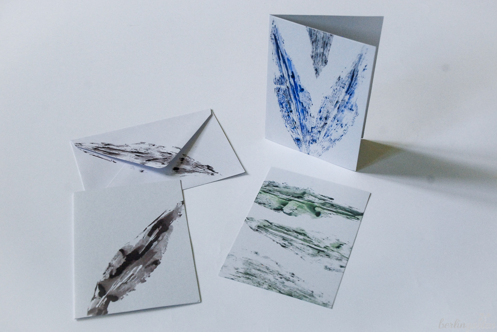 Ich habe gleich den Vorrat an Grußkarten, Kuverts, Geschenkpapier oder Geschenketüten aufgefüllt. Mir gefällt es, selbstgemachte Dinge zu versenden oder selbst zu nutzen. Als Materialien zum Bedrucken eignet sich alles aus festerem Papier oder Karton (auch transparentes oder farbiges ist schick), Leinwand-Rohlinge oder auch Stoffbeutel oder T-Shirts (dann Stoffmalfarbe verwenden).