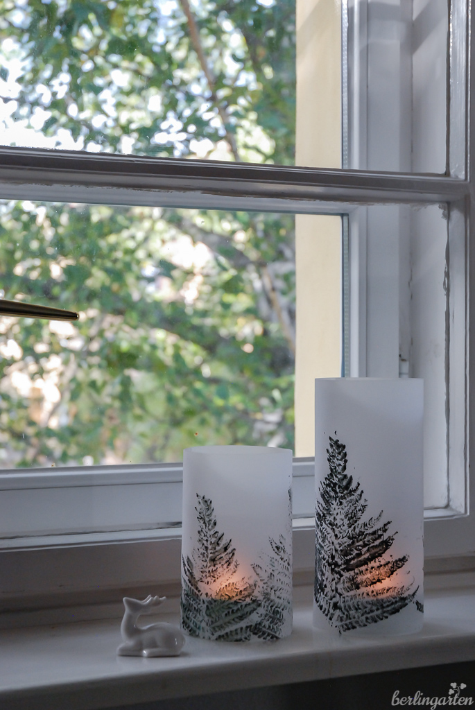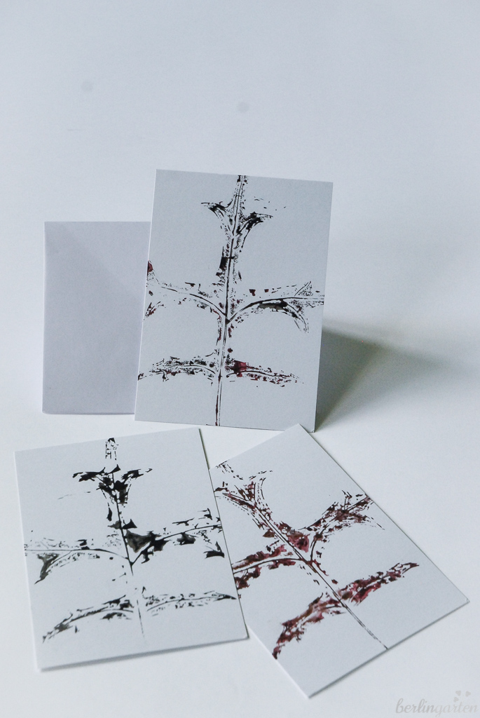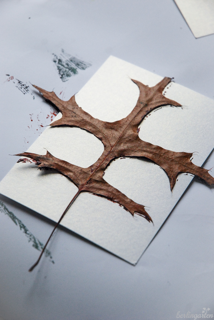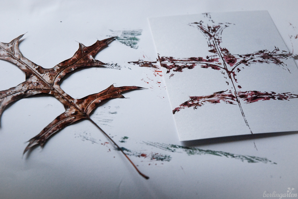 Farnblätter passen bestens, Tannenbäumchen zu drucken. Mit zum Rund geklebtem Transparentpapier ergeben sich winterliche Windlichter. Bizarre Eichenblätter eignen sich, um Kondolenzkarten zu fertigen. Da habe ich nach drei Exemplaren mit der Produktion allerdings aufgehört. Ich hoffe, dass ich die nächsten Jahre wenige brauchen werde… Gleichwohl sind wir hier wieder beim ewigen Kreislauf von Werden und Vergehen. Und dem Bewahren von Erinnerungen.