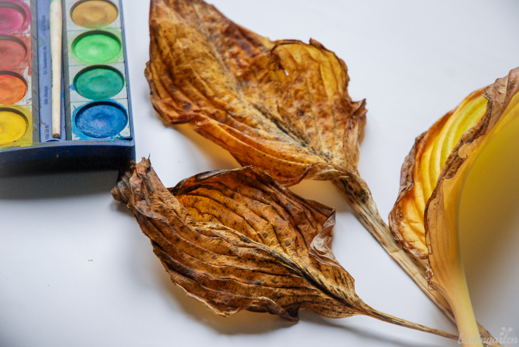 Da ich den Zeitpunkt dieses Jahr schon wieder verpasst habe, musste eine andere Form der Konservierung meines Gartenjahres her. Die Idee war: Ich drucke mit meinen vergehenden Blättern ein Bild, sodass deren Strukturen bei mir im Wohnzimmer an der Wand überdauern. Als Pflanze hatte ich die Hosta erkoren, deren Blattwerk besonders auffällig vergeht – heute noch schön und kräftig, morgen schon komplett in sich zerfallen.