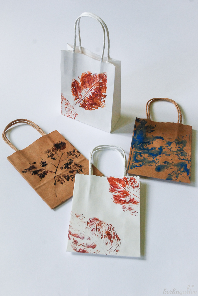 Es eignen sich Acrylfarben, aber auch ganz normale Wassermalfarben, wie man sie aus der Schule kennt. Vielleicht sind sie sogar besser geeignet, weil das Wasser die Blätter geschmeidig hält und sie nicht so stark pigmentiert sind. Mit ihnen lassen sich die Blätter nahezu unbegrenzt nutzen. Die Farbe wird mit einem Pinsel aufgetragen und das Blatt dann schlichtweg auf den Untergrund gepresst. Achtung: Tropfgefahr.