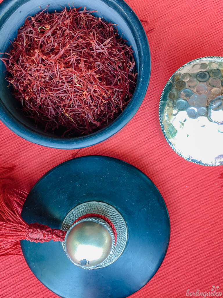 Als wir Christine im November zur eigentlichen Safranerntezeit besuchten, war leider nicht viel von den lila Zwiebelblühern zu sehen. Die Trockenheit hatte auch Marokko schwer zugesetzt und die Bewässerung nur für einen Teil der Felder ausgereicht. Meine Vorstellung von einem violetten Meer bis zu den schneebedeckten Bergen bewahrheitete sich leider nicht. Aber: Kein schönes Foto machen zu können, ist schade, eine komplette Missernte zu verbuchen, jedoch eine Katastrophe. Ich drücke Christine sehr die Daumen, dass das nächste Jahr ausgleicht, was jetzt an Einnahmen fehlt.