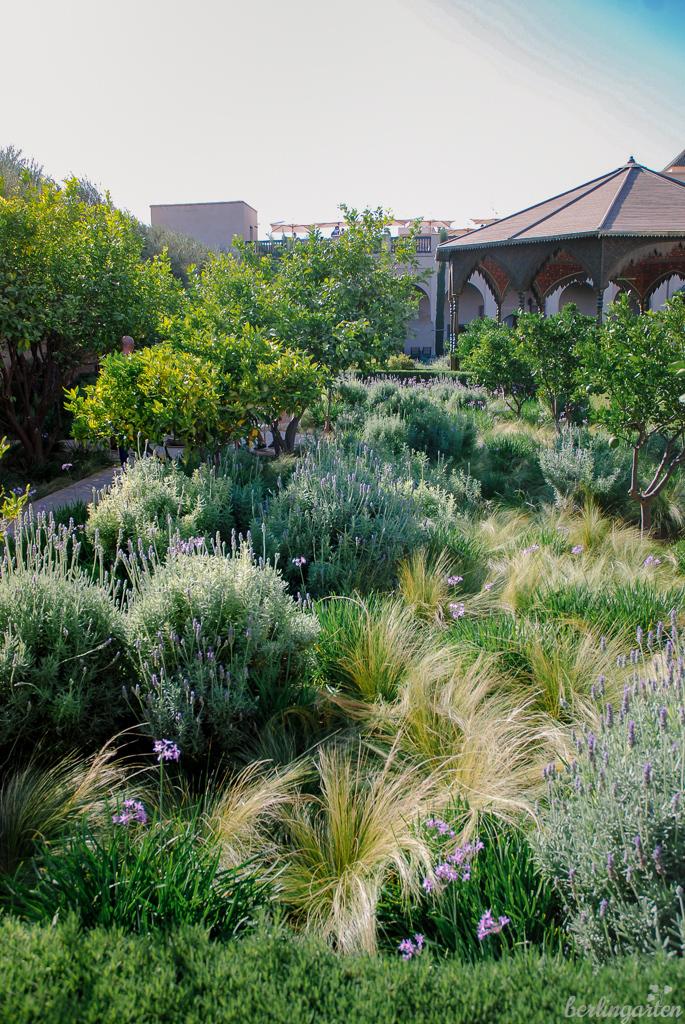 Über die Riads von Marrakesch, die Häuser mit Innenhofgärten, habe ich schon im letzten Marrakesch-Artikel berichtet. Ein besonderes Kleinod dieser Art ist der Jardin Secret, der 2013 aus einem völlig heruntergekommenen Palast aus der Saadischen Ära (1549–1664) entstand. Es musste alles erneuert werden: der 17 Meter hohe Turm, alle Gebäude sowie der Garten. Kein Geringerer als Tom Stuart-Smith, britischer Gartendesign-Star, dessen heutigen Stil man als ‚überzeichneten Naturalismus‘ bezeichnen kann, erhielt den Auftrag. Hier in der Altstadt Marrakeschs entwarf er zwei Hofgärten: Ein kleinerer, der „Exotic Garden“, soll mit Pflanzen aus Nord- und Südafrika sowie dem Mittelmeerraum einen christlichen Paradiesgarten darstellen. Ein großer islamischer Garten zeigt die typische Vierteilung mit Wasserspiel und Laube in der Mitte. In ersterem begeisterte mich ein atemberaubend schöner Florettseidenbaum (Ceiba speciosa), im zweiten muss es insbesondere am frühen Morgen und späten Abend traumhaft sein, wenn weniger Menschen vor Ort sind. „Secret“ ist der Jardin Secret nämlich lange nicht mehr. Schnell hat sich herumgesprochen, dass es hier auf rund 4.000 Quadratmetern zwei schöne Gärten, einen Turm mit tollem Blick über die Stadt sowie ein kleines Dachgartencafé gibt.
