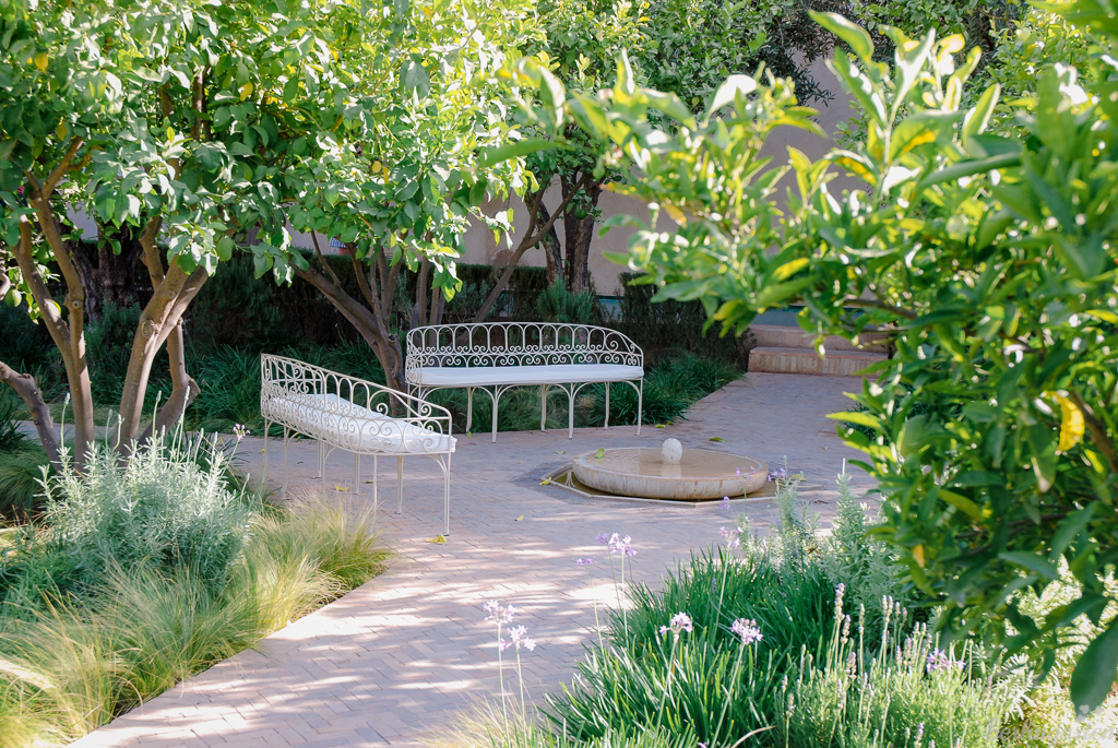- Wasserspiele und filligrane Bänke im hinteren Teil des Jardin Secret