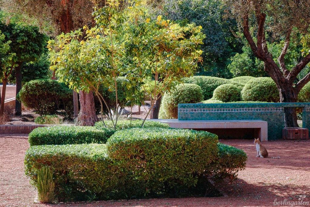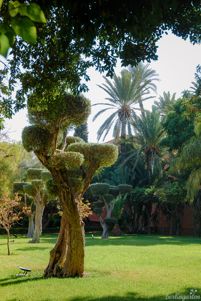 Aber noch rasch ein paar Worte zur Anlage: Der Garten ist mit 8 Hektar recht groß und zweigeteilt: der zur Altstadt zugewandte Bereich war früher Protektoratsgarten und wurde sehr dekorativ mit breiten Alleen, vielen kreativen Formschnittgehölzen und hohen Bäumen gestaltet. Hier erlebt man, wie abwechslungsreich die Farbe Grün eingesetzt werden kann. Es gibt viele Bänke, auf denen Einheimische und Touristen rasten und sich vom Trubel der Stadt erholen. Der hintere Bereich war einst ein Arsat, ein riesiger Garten, in dem es unzählige Olivenbäume gab und in dem die Bevölkerung Obst und Gemüse anbauen konnte. Heute wachsen dort wieder Oliven- und Zitrusfruchtbäume. Ob wir hätten zugreifen können – ich habe es nicht ausprobiert.