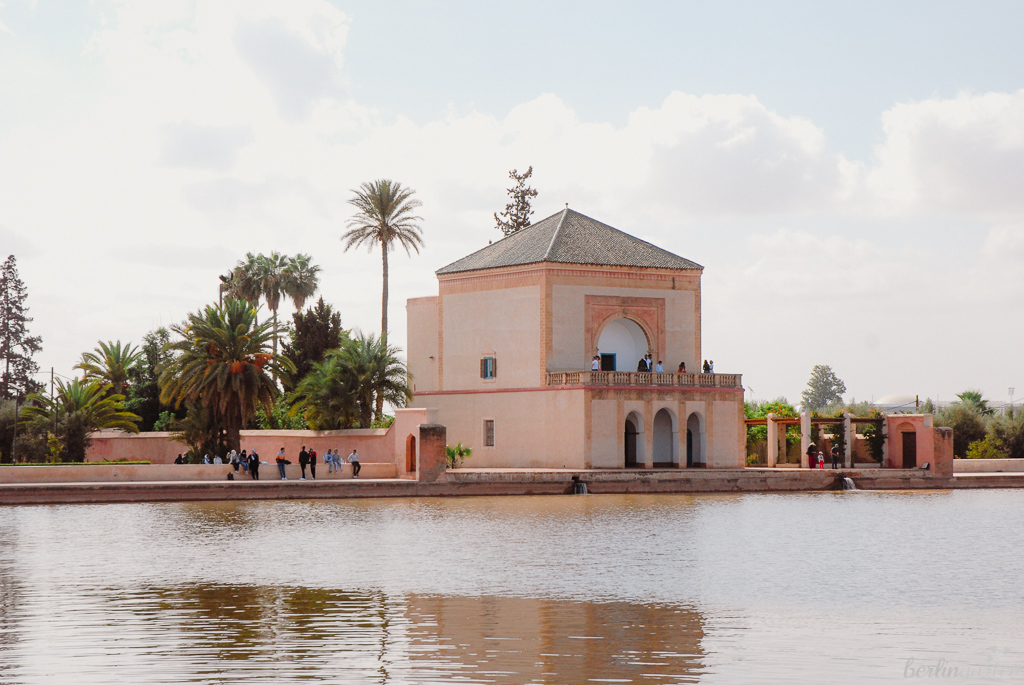 Der Ménara-Garten ist nach dem Koutoubia-Minarett vermutlich die bekannteste Sehenswürdigkeit der Stadt und extrem beliebt zum Flanieren und Picknicken bei den Einheimischen. Der Garten wurde um 1150 im Rahmen eines Stadtverschönerungsprojekts angelegt und hat als Grundidee, landwirtschaftliche Flächen mit einem Lustgarten zu kombinieren. So gibt es als zentrales Element ein großes Wasserbecken, um das sich spazierengehen lässt. Es dient als Wasserreserve für die rund hundert Hektar Olivenhaine darum herum. Faszinierend, dass es hier seit fast einem Jahrtausend ein Hydrauliksystem gibt, das über eine Entfernung von 30 Kilometern Wasser aus den Bergen zuleitet.
