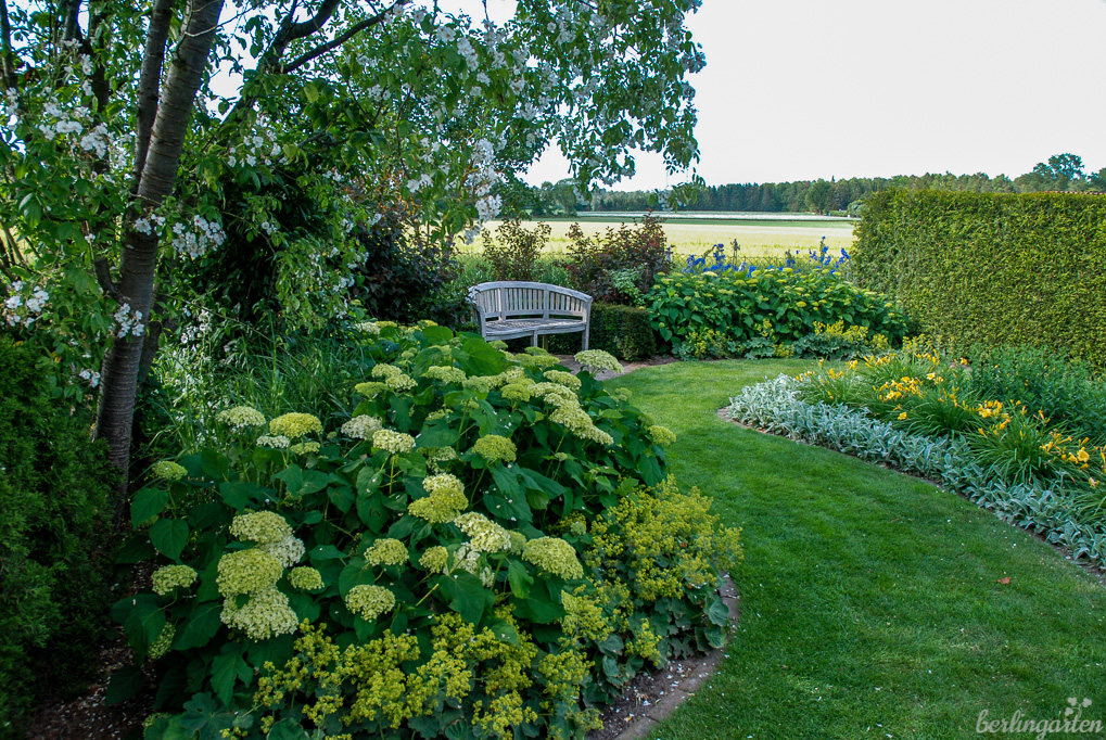 - Bänke zum Ausruhen und als Blickfang sind immer eine gute Idee. Hortensie ‚Annabelle‘ bekommt besonders guten Stand durch gebogene Metallgitter aus dem Baumarkt, durch die sie hindurchgewachsen sind
