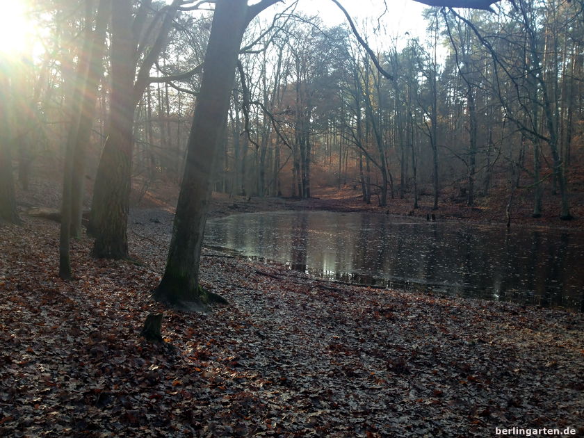 Der Spaziergang fand dann auch statt, in milder Luft, bei Licht in pastell und auf kleinen Wegen abseits der Trampelpfade. Goldenes Buchenlaub, Sonnenstrahlen, die die Rinde der Birken zum Leuchten bringen, Spiegelungen auf den Wasserflächen kleiner Tümpel. Berlin kann so schön sein.