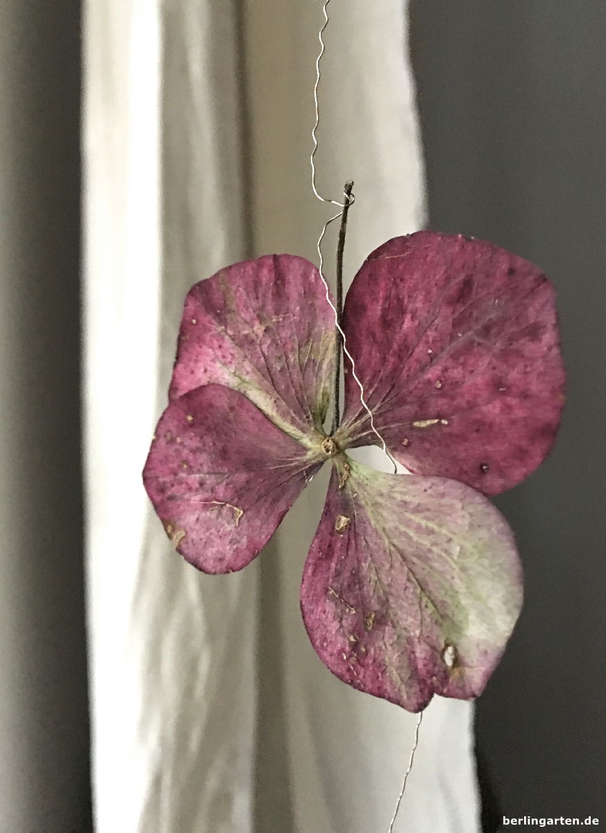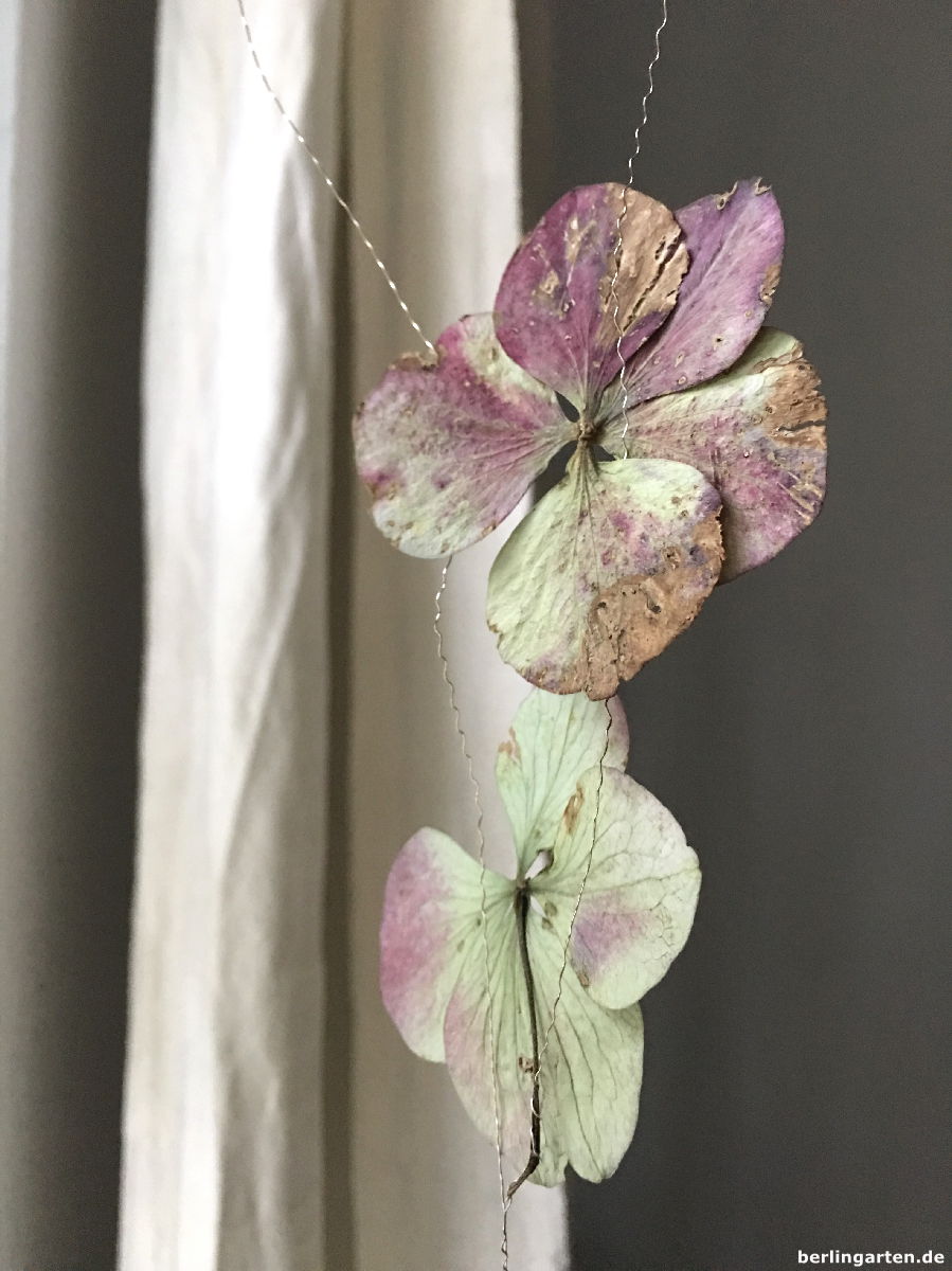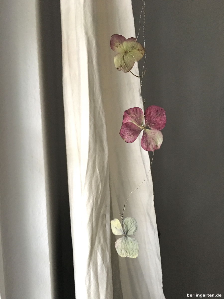 Und dann heißt es nur noch, mit möglichst zartem Draht die einzelnen Blüten an den kleinen Stielen zu befestigen und vors Fenster oder eine Wand zu hängen oder die Girlande über ein Gesteck zu legen oder, oder, oder. Hast du viele Hortensien im Garten, könnte es so eine ganze Gardine werden, ich Schrebergärtnerin begnüge mich mit nur zwei Girlanden-Strängen. Ich mag es aber auch gerade so reduziert und erfreue mich an jeder einzelnen Blüte. Sehen sie nicht aus wie Schmetterlinge, die vorm Fenster tänzeln?