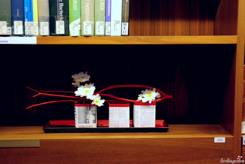 „Danke Ernte“ statt Erntedank – ich bin immer wieder fasziniert von der Kreativität, mit der Ikebana-Künstlerinen ein bestimmtes Motto umsetzen und dabei gern um die Ecke denken. Zugute kommt ihnen, dass die Sogetsu- eine verhältnismäßig junge und moderne Ikebana-Schule ist. Sie wurde erst 1926 von Sofu Teshigahara ins Leben gerufen worden. Er gab das Motto aus, dass Ikebana zu jeder Zeit, an jedem Ort, mit jedem Material und von jedermann möglich sein sollte. Auch führte er die Verwendung von Materialien wie Papier und Metall ein. Spannend war für mich in der Ausstellung überdies der Einsatz von Gemüse, im Ikebana Morimono genannt. Da gaben Knoblauch und Chili einem Arrangement den besonderen Pepp und bei einer Möhre auf einem mathematischen Buch fragten sich die Besucher, ob dies nun einen Bücherwurm darstellen solle oder eher die „Wurzel aus“? Der Frau hinter dem Werk war beides recht – denn ist es nicht schon ein Erfolg, wenn Ikebana die Besucher zu einem Schmunzeln und zum Gespräch animiert?