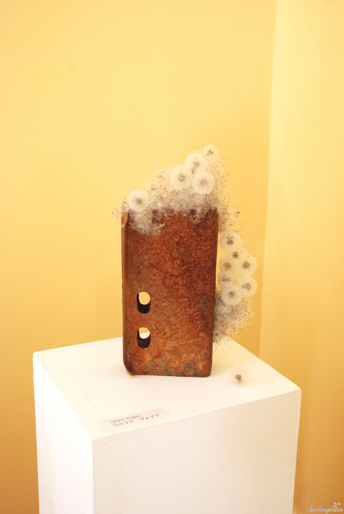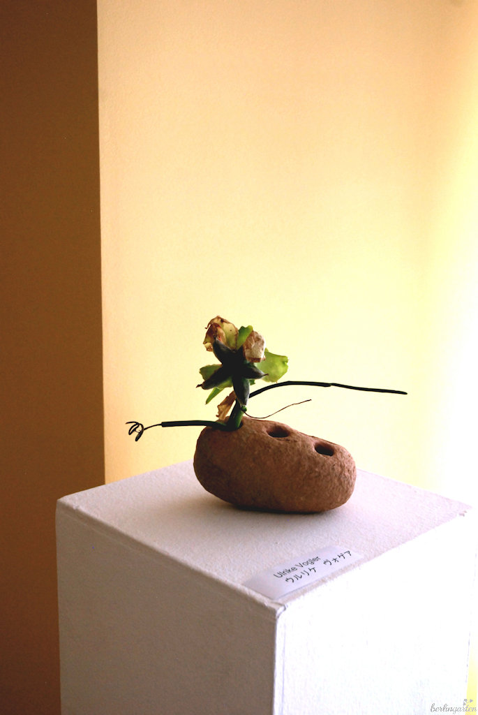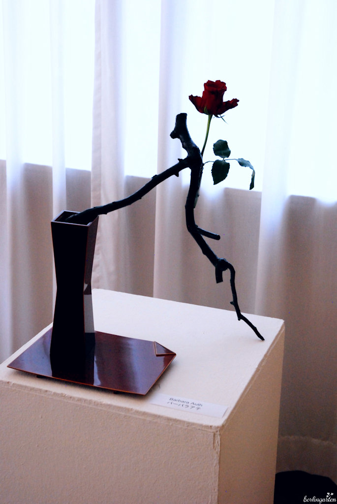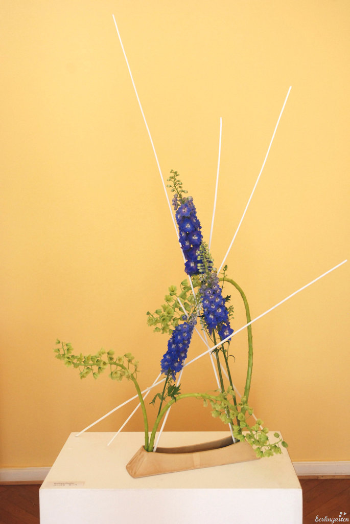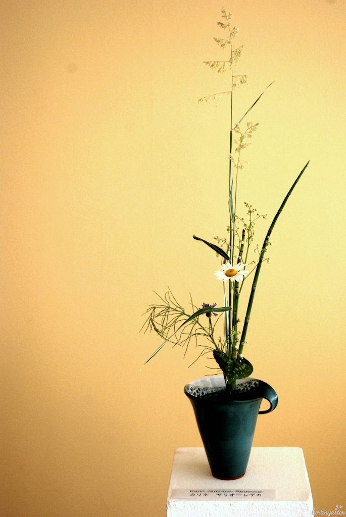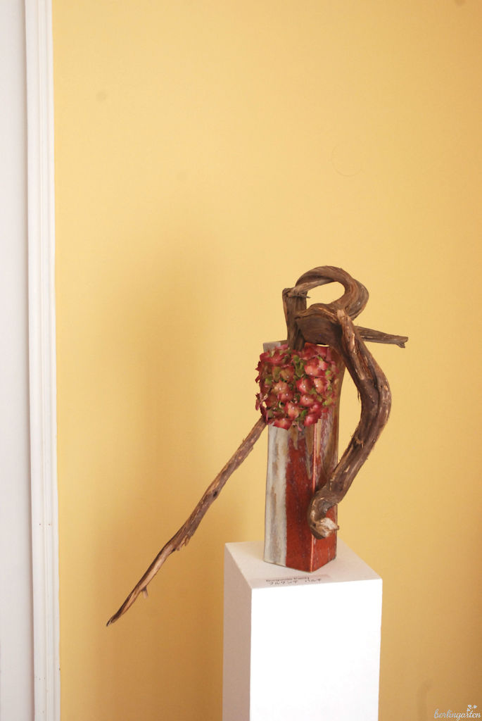 Ich fühlte mich von den Exponaten wieder einmal inspiriert, klassische Denkmuster zur Verwendung und Verarbeitung von Blumen über Bord zu werfen. Die Ikebana-Gruppe zeigte, dass mit Sprühkleber, Kabelbindern, wettergegerbtem Holz, Klinker und Metall individuelle Kreationen entstehen können. Selbst verblühte Blüten wie die Päonie oder Kaffeestiele in Coffee-to-go-Geschirr überzeugten mit ihrer ganz eigenen Ästhetik.