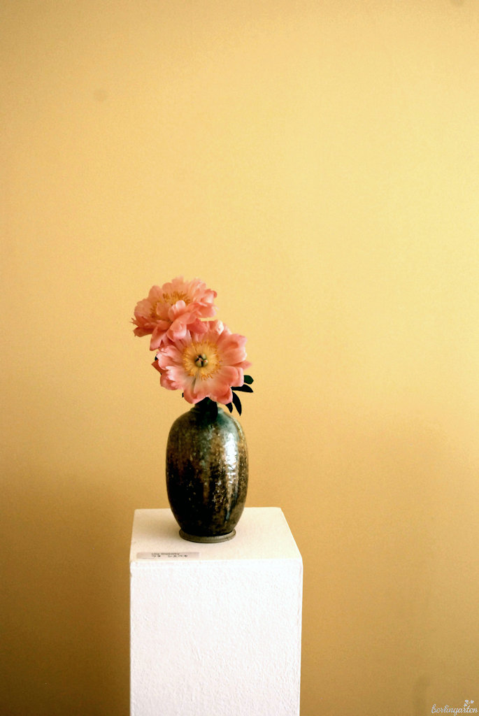 A pro pos Gefäße: Verblüffend ist immer wieder, dass Vasen, Becher oder Schalen, die ganz ähnlich auch bei mir im Schrank als vermeintlich „altmodisch“ versauern, durch den Minimalismus des Ikebana zeitgemäß und wunderschön aussehen.