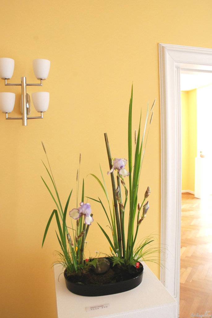 Iris so gesteckt, dass sie wie an ihrem natürlichen Bachufer-Standort wirken, Pusteblumenkugeln, die so vergänglich sind, hier aber stabil rostiges Eisen ergänzen, Gartenrosen, die, obwohl krumm und schief, charaktervoller als jede Rose aus dem Laden erscheinen: Schülerinnen und Kolleginnen der Ikebana-Lehrerin und Floristmeisterin Ulrike Vogler zeigten in einer kleinen, feinen Ausstellung kreative Gestecke mit Frühsommerblumen. Das passende Ambiente boten die zart gelb gestrichenen Räume der Villa Donnersmarck im Stadtteil Zehlendorf.
