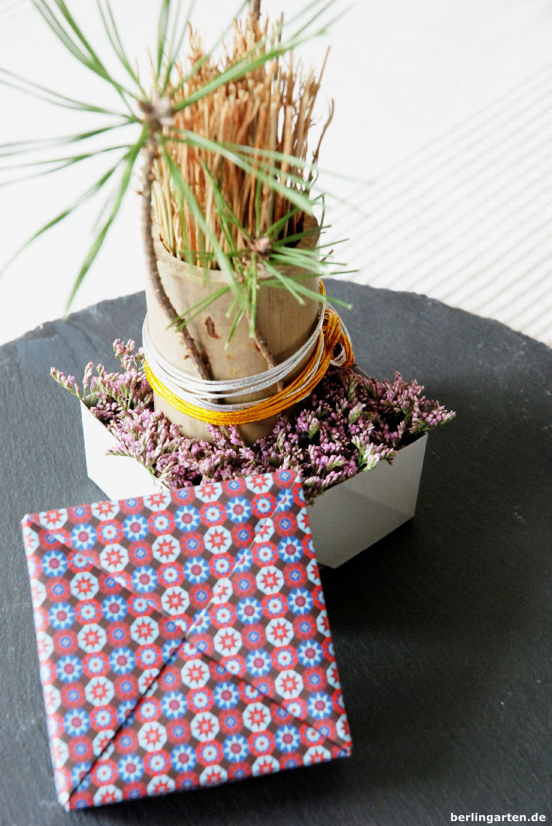 Zentral in meinem Kadomatsu war ein dicker Bambusring, gefüllt mit Reisstroh, den ich auf eine einheitliche Höhe gestutzt hatte. Mit den Mizuhiki konnte ich drei Kieferzweige befestigen, die ich bis auf die Spitzen entnadelt hatte, sodass sie ein wenig wie Palmen wirken. Als letztes habe ich die Schachtel mit lila Statice gefüllt – stellvertretend für die Pflaumenblüten und farblich passend zum Muster meines Schächtelchens.
