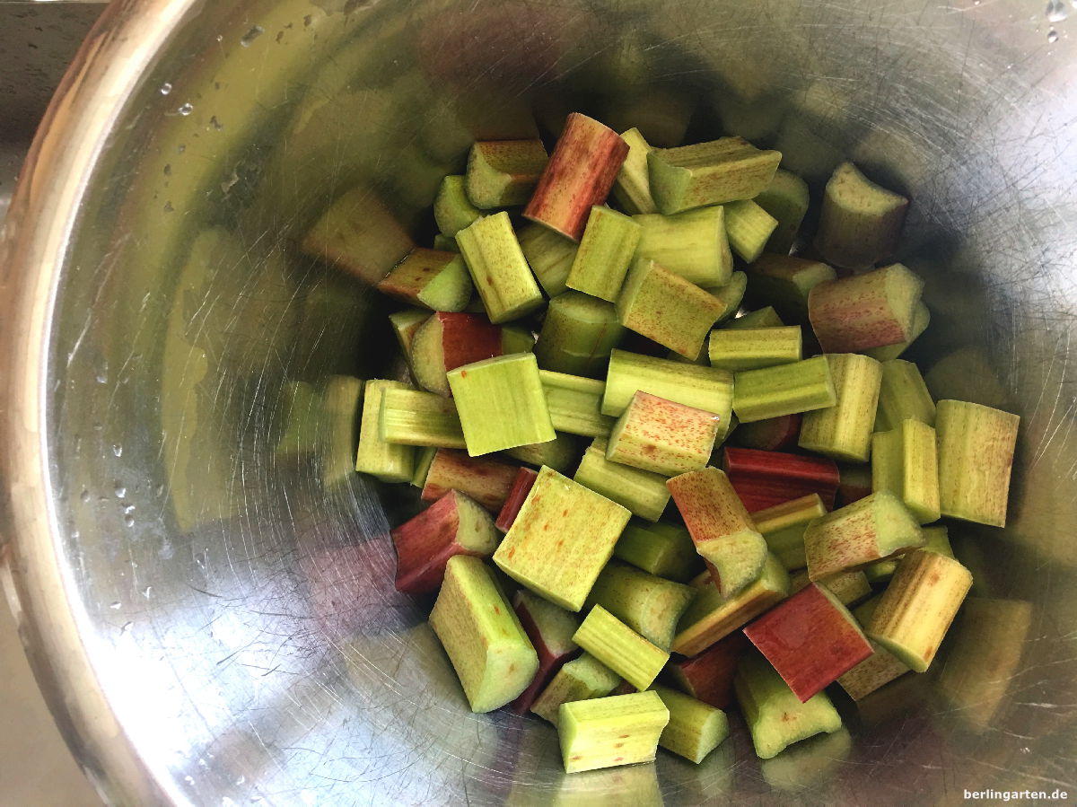 - Rhabarber geschnitten und gezuckert. Ich habe noch nicht mal geschält