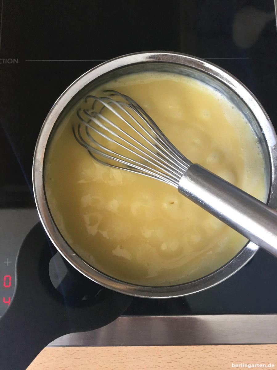 - Pudding nach Packungsanweisung zubereiten, etwas abkühlen lassen