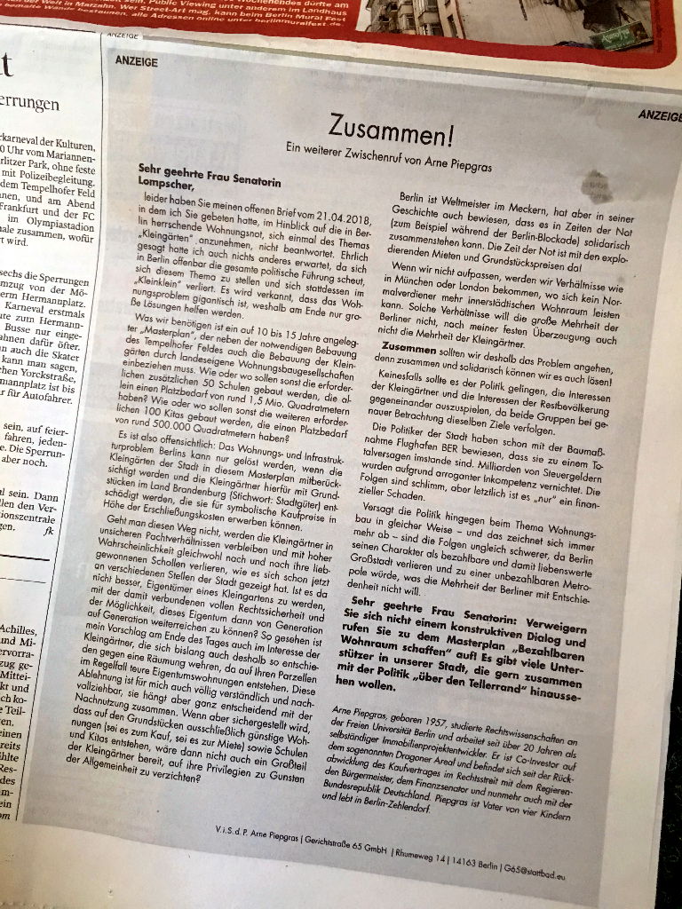 Herr Piepgras veröffentlichte vor wenigen Wochen eine Anzeige im Berliner Tagesspiegel, in der er von Bausenatorin Lompscher den „Tabubruch“ forderte, nun endlich die innerstäditischen Kleingärten für den Wohnungsbau zu schleifen. Gestern legt er nun nach mit einem weiteren „Zwischenruf“ an die Senatorin. „Zusammen!“ lautet die Überschrift eines Briefes, in dem er abermals die Bebauung der Kleingärten – und übrigens auch des Tempelhofer Feldes – fordert. Nach seinem großen Echo im Netz und in den Medien geriert sich der Zehlendorfer diesmal deutlich sozialer, bringt die Buzzwords „Schulen“, „Kitas“, „günstige Wohnungen (sei es zum Kauf, sei es zur Miete)“ und gipfelt in der rhetorischen Frage: „…wäre dann nicht auch ein Großteil der Kleingärtner bereit, auf ihre Privilegien zu Gunsten der Allgemeinheit zu verzichten?“