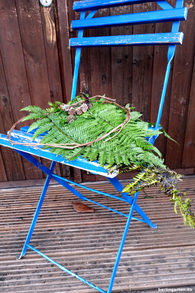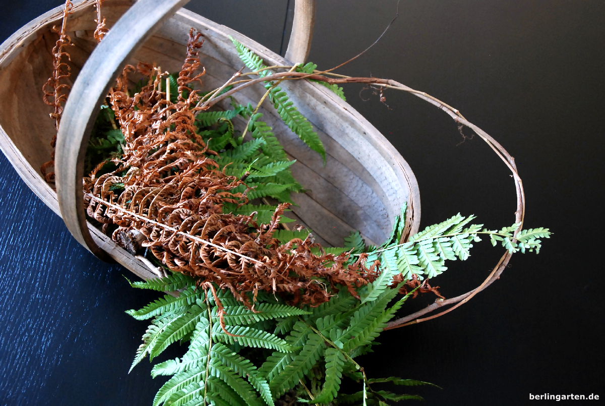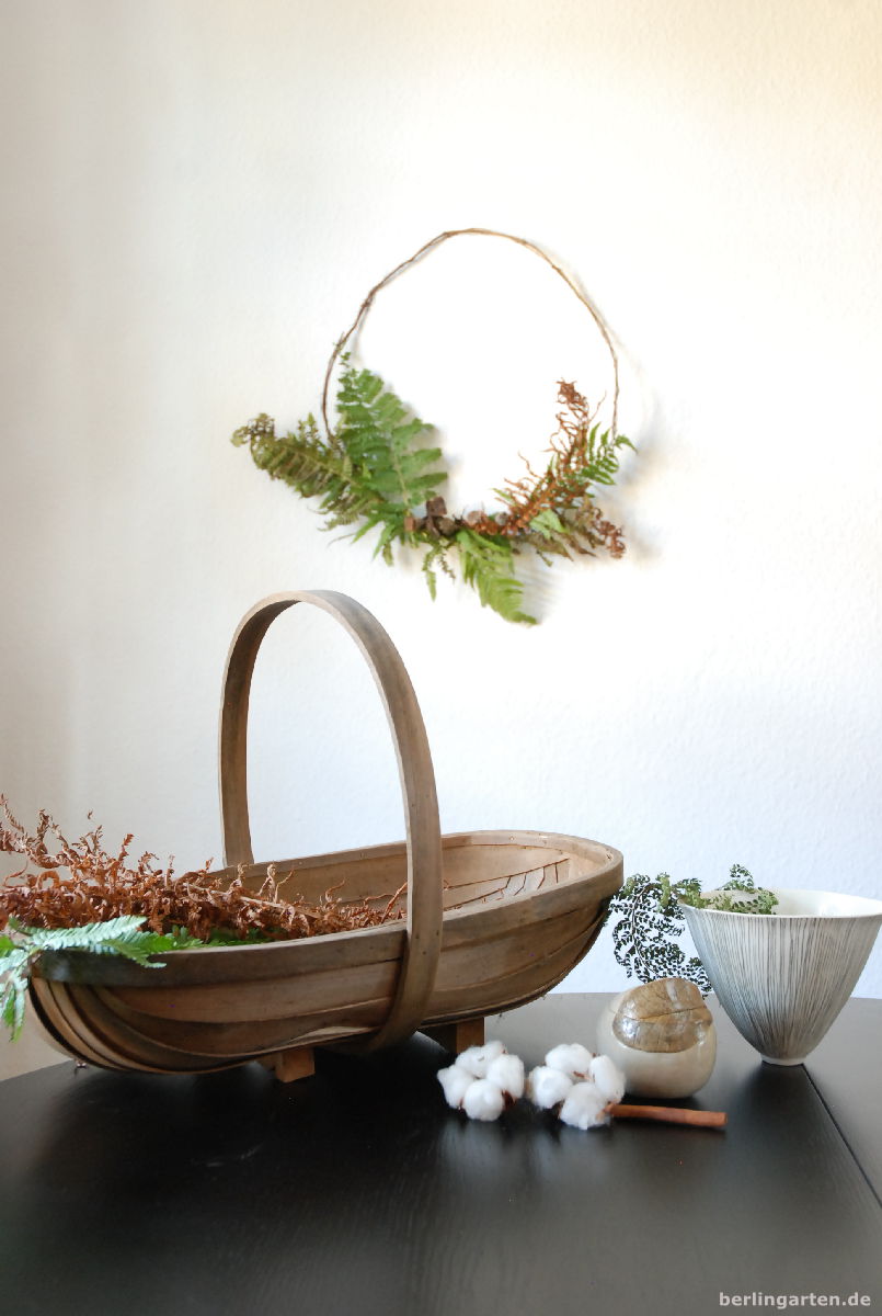 Also, ich finde den Kranz toll! Mit Korb und Keramik arrangiert, aber auch den Kranz solo! Eben weil allein die Naturmaterialien sprechen und der Farn in verschiedenen Stadien zu betrachten ist.