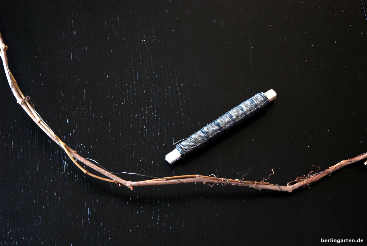 Einen Trieb des wilden Weins mit Draht zum Kranz biegen. (Normalerweise winde ich den Kranz aus mehreren Ruten und brauche dann keinen Draht, jetzt wollte ich den Kreis aber ganz dünn haben.)