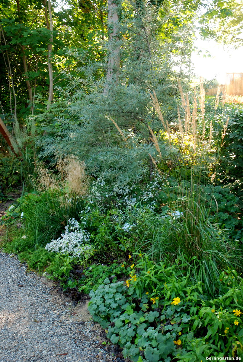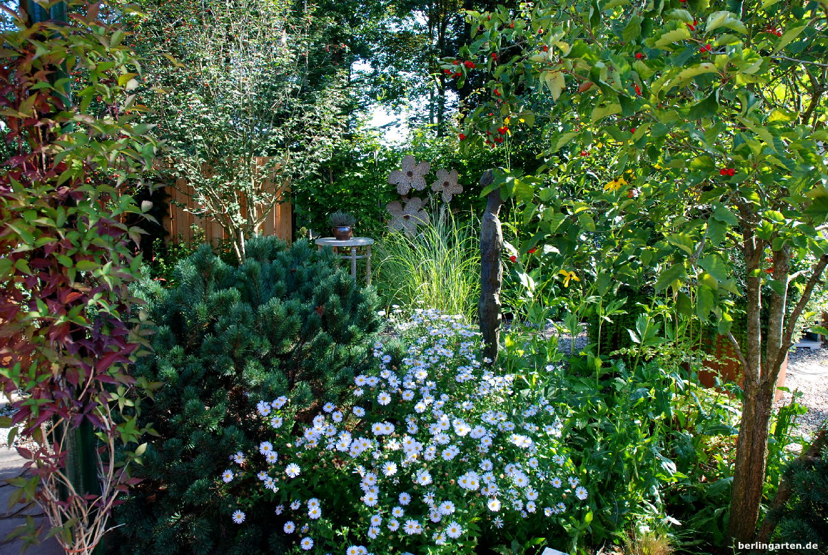 Es gab viele Storchchnäbel, Astern, Schönastern, Sonnenhüte, Duftnesseln, Knöteriche, Gräser. Dazu, wie schon gesagt, interessanterweise auch Nadelgehölze. Auch habe ich sehr hübsche Obstgehölze gesehen, die für mich in einen Wohlfühlgarten auch unbedingt hineingehören!