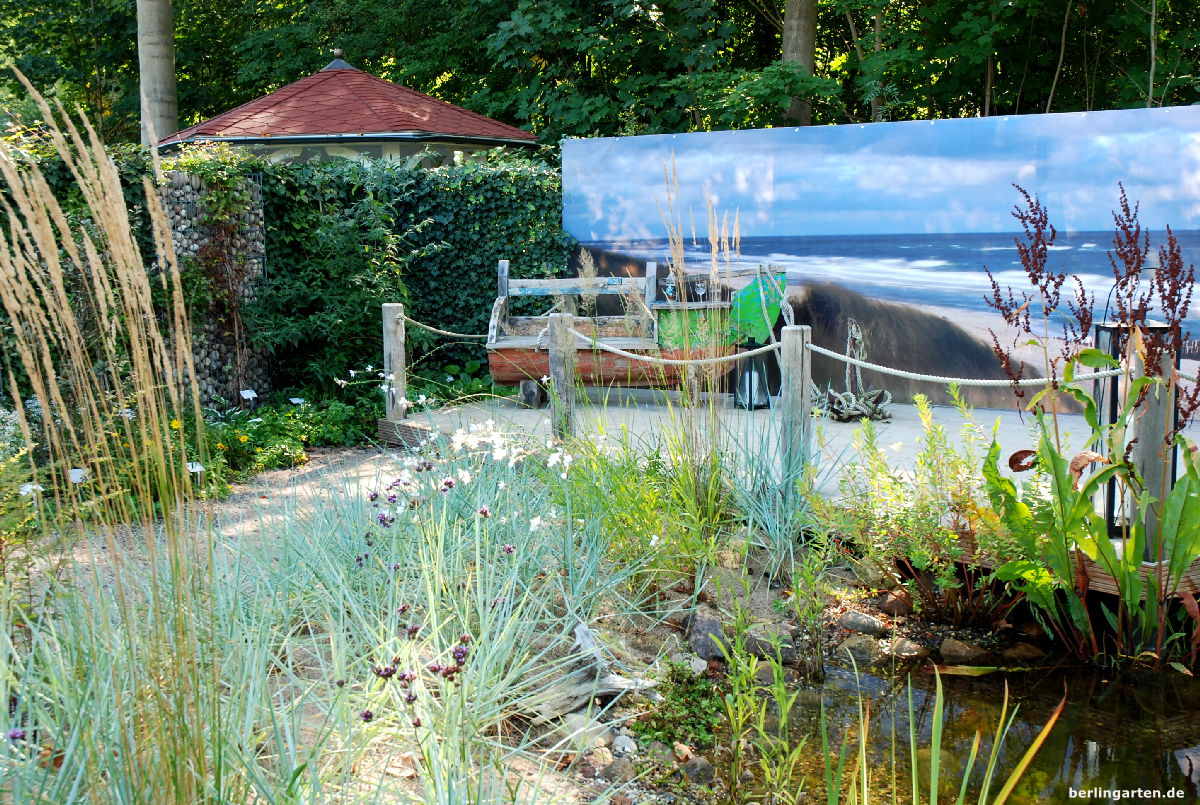 Der Plan ging auf. Und obwohl Eutin im Stil der Pflanzenverwendung ziemlich nahtlos an Brandenburg anschloss, habe ich durchaus Neues entdecken können. Mal davon abgesehen, dass Eutin, meine Geburtsstadt übrigens, tatsächlich eine bezaubernde Kulisse abgibt, hat mich das regionale Moment in den Pflanzungen begeistert. Sehr deutlich wurde die Nähe zur Ostsee: Gräser, Wasser, kühle Töne und beige. Koniferen, zum Beispiel Kiefern, waren in die Rabatten integriert. Pflasterungen gab es, die sehr schön an die Backsteingebäude der Gegend erinnerten, Holzhäuschen, die ein Flair von Strandpromenaden verbreiteten. Das ist eine absolute Anregung auch für uns als Privatgärtner, den Garten als Spiegel unserer Heimat zu begreifen.