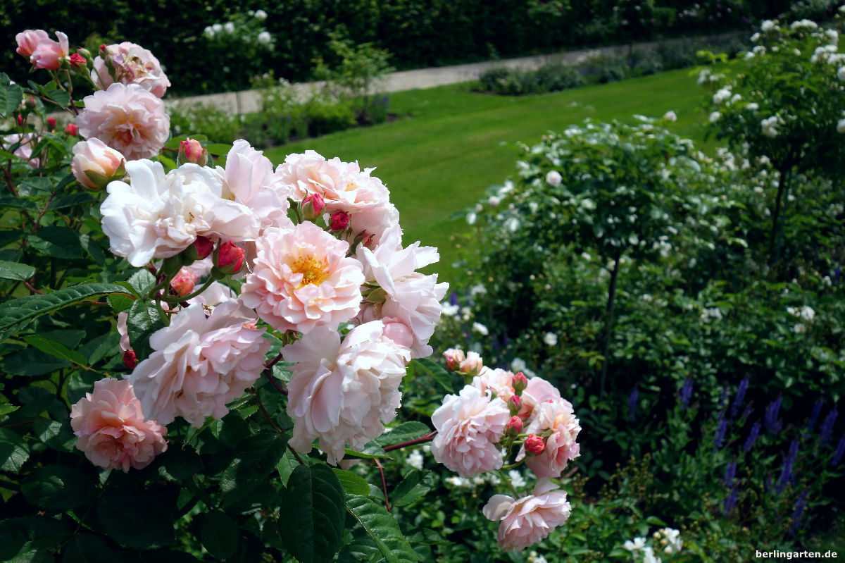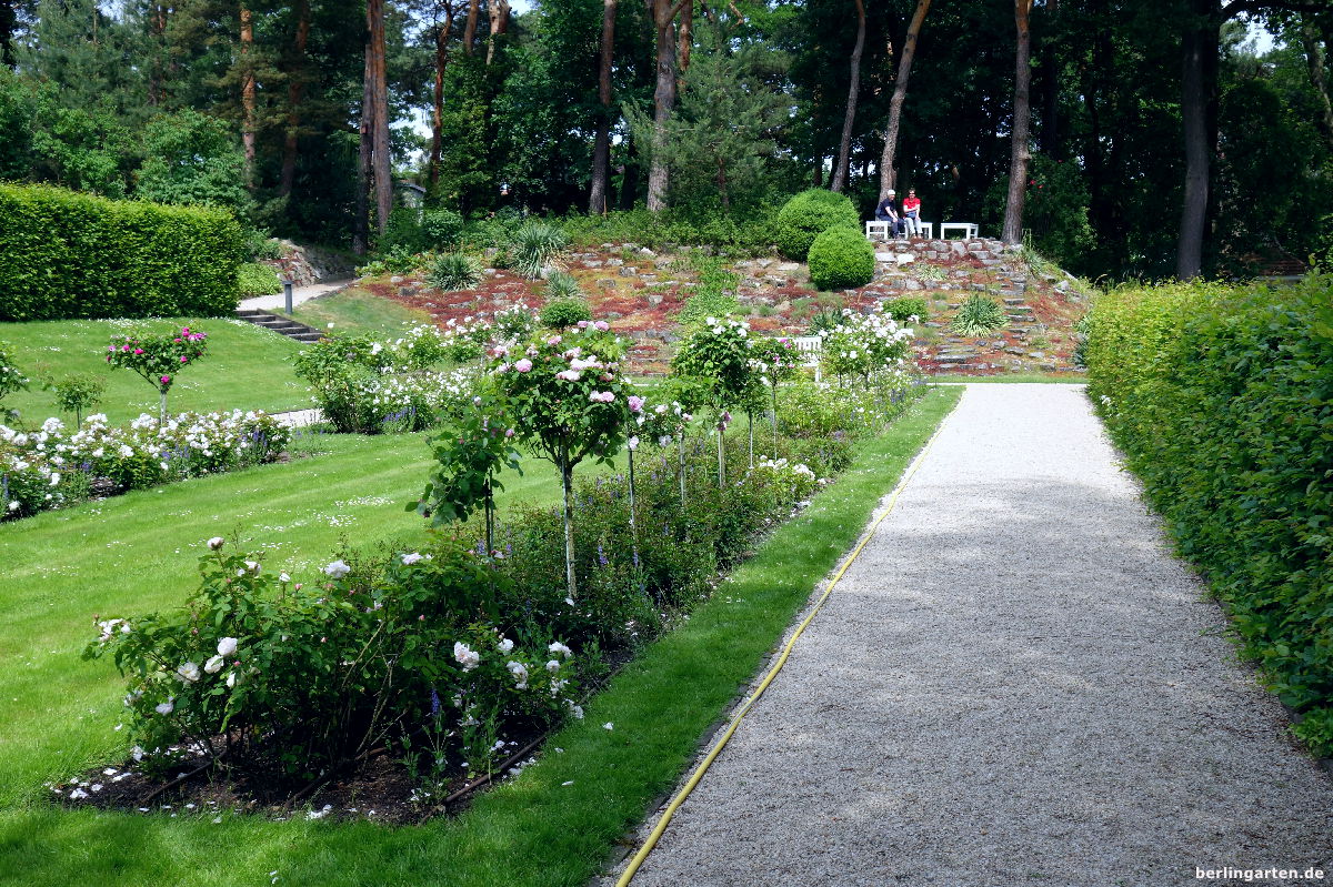 - Der Rosengarten besteht aus einem Mix aus Hochstamm- und Beetrosen