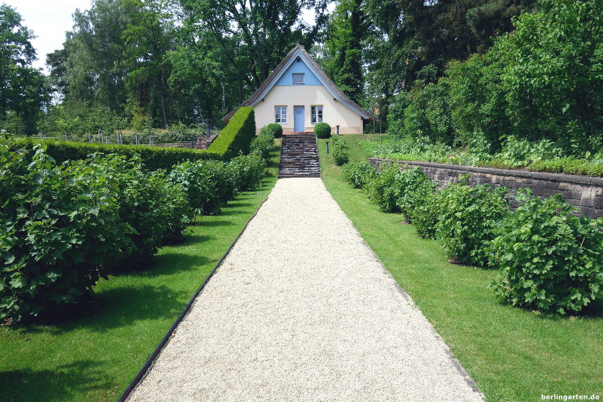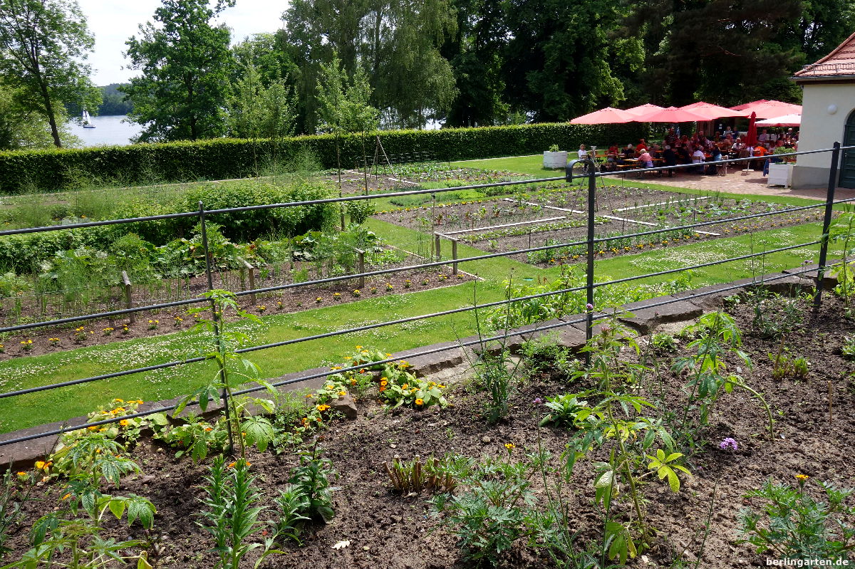 Für Max Fränkel gestaltete Barth eine mehrfach gegliederte, regelmäßige Gartenanlage, bei der er die Topografie – das Gelände fällt zur Havel steil ab – klug berücksichtigte und Terrassen mit unterschiedlichen Gartenbereichen anlegte. Es gibt ein kleines Alpinum, einen Rosen- sowie einen großen Obst- und Gemüsegarten. Hier ist auch das heutige Café untergebracht, man sitzt bei warmem Wetter sehr hübsch unter großen roten Sonnenschirmen. In einem weiteren Gebäude, dem ehemaligen Geflügelhaus, finden in diesem Sommer Ausstellungen statt: jeweils für vier Wochen nutzen mehrere Künstlerinnen das Gebäude als Studio und präsentieren am Wochenende ihre Werke (das erste am 22. und 23. Juli mit der Künstlerin Beret Hamann).