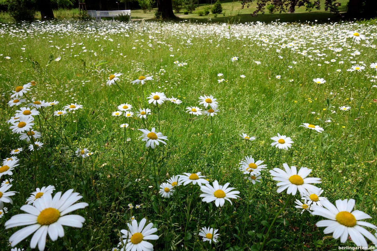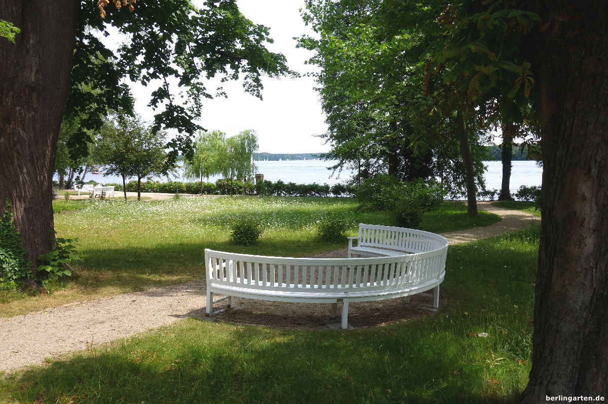 Richtung Havel schließt sich ein Landschaftsgartenbereich mit wilden Wiesen, Wasserfall, Teichen und einem Teepavillon an. Auf den weißen Holzbänken schaut man über das Wasser und fühlt sich wie in einem Roman von Thomas Mann.