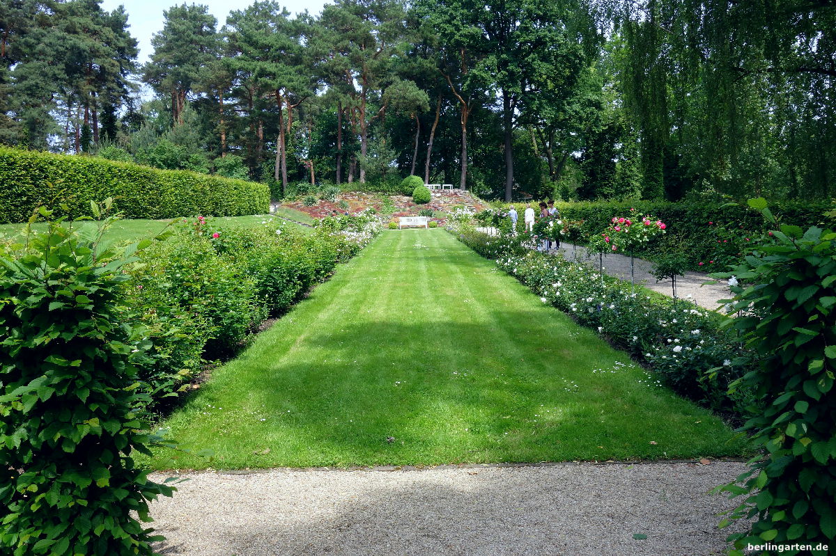 - Der Fränkelsche Rosengarten verläuft geometrisch um eine Rasenfläche
