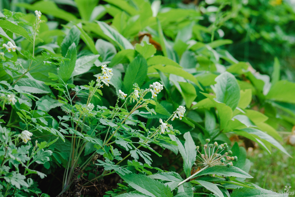 Die Stauden bilden schöne Horste, blühen unermüdlich und behalten ihr filigranes Laub die ganze Saison – in diesem milden Winter sogar das ganze Jahr hindurch. Eine meiner Lieblingsstauden überhaupt ist der Gelblichweiße Lerchensporn (Corydalis ochroleuca), der nach milden Wintern bereits Ende März blüht und dies bis zum November tun wird. Pro Saison schneide ich ihn bestimmt dreimal zurück und immer treibt er wieder frisch durch.