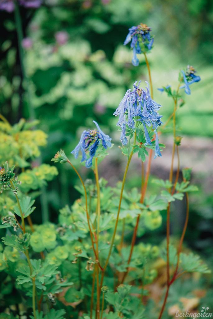 - Der blaue Lerchensporn Corydalis elata x flexuosa ‚Spinners‘ blüht im Mai/Juni und hat es gern etwas feuchter. Er wächst aus einem Rhizom