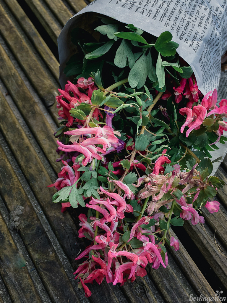 In unserem Hofgarten gibt es auch riesige Teppiche von Lerchensporn. Da habe ich mir gedacht, würde es sicher nicht schaden, wenn ich mir ein paar Exemplare ausbuddeln würde. Gar nicht so einfach, weil die Knollen relativ tief liegen.