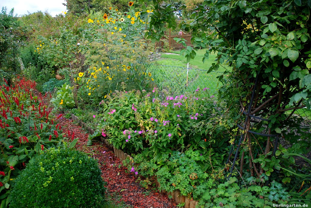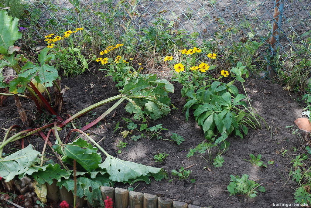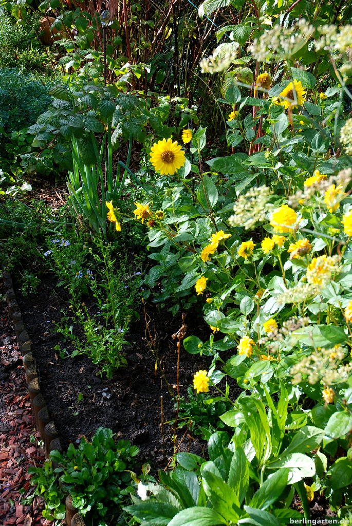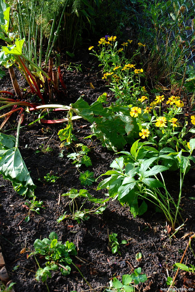 Unverändert geblieben sind die Sonnenblumen Helianthus decapetalus, ein riesiger Fenchel und ein Rhabarber. Ja, gemischte Beete sind bei mir auch tatsächlich gemischt. Da gehören Kräuter, Obst und Gemüse mit dazu.