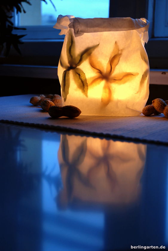 Dazu habe ich die Hüllen von Physalis gepresst, sie zwischen zwei Butterbrotpapier-Tüten geklemmt und ein Glas samt Teelicht hineingestellt. (Achtung, leicht entflammbar!)