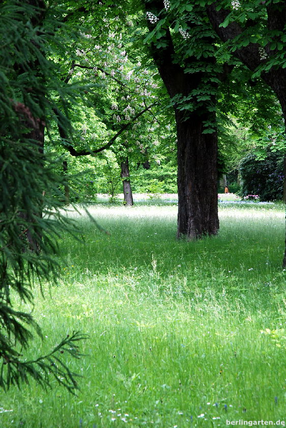 - Im Koniferenhain steht das Gras hoch im Mai.