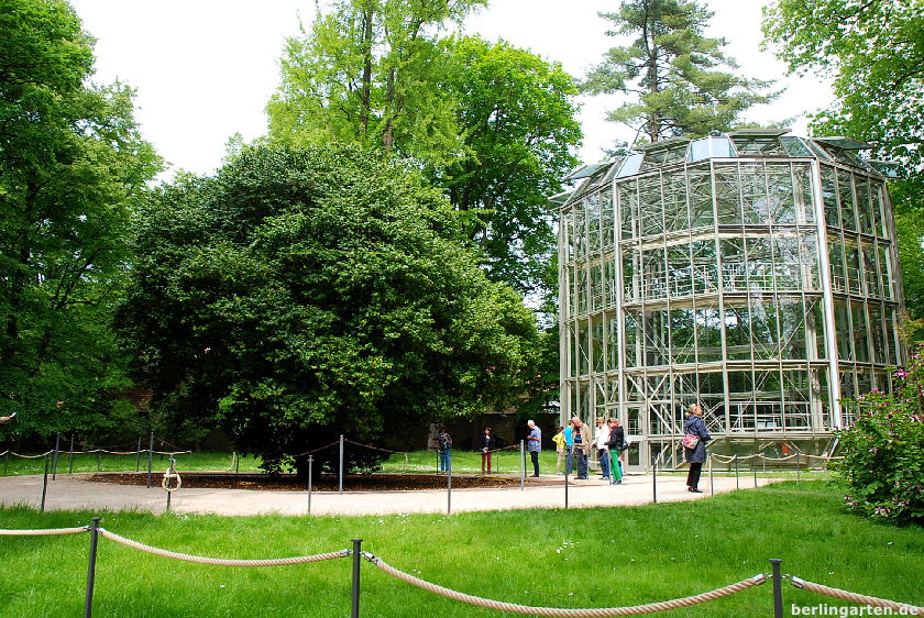 Dass die Camellia japonica in unseren Breiten nicht winterhart ist, wussten die Gärtner zum Glück. Von Anfang an schützte man die Kamelie im Winter durch Holzhäuser, was durch das Wachstum von Jahr zu Jahr komplizierter wurde. Das heutige Glashaus de luxe erhielt die Pillnitzer Kamelie 1992. Es ist fahrbar und verfügt über eine computergesteuerte Regelung von Temperatur, Belüftung, Luftfeuchte und Schattierung. Jetzt war das Haus neben die Kamelie gerollt, so dass die gesamte Größe des Strauches sichtbar wurde. 8,60 m hoch und mit einem Durchmesser von fast 11 m ist er wirklich beeindruckend.