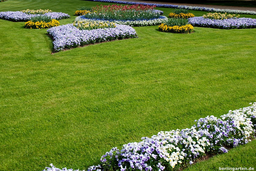 - Langgezogene Blumenstreifen Richtung Bergpalais, die Tulpen verblühen soeben.