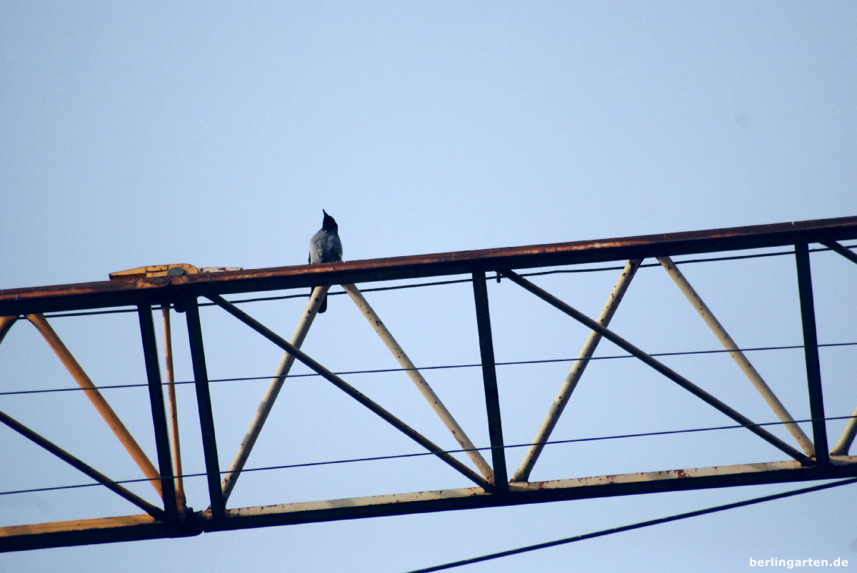 - Baustellen-Idylle: Über unseren Köpfen schweben die Ausleger der Baukräne. Achtung: Krähenglück von oben