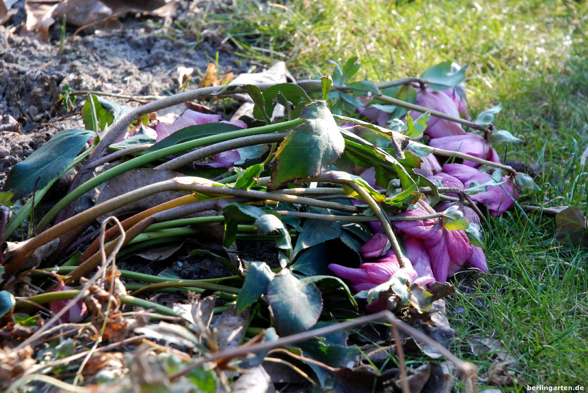 - Die Lenzrose schützt sich durch hinlegen vor Frostschäden