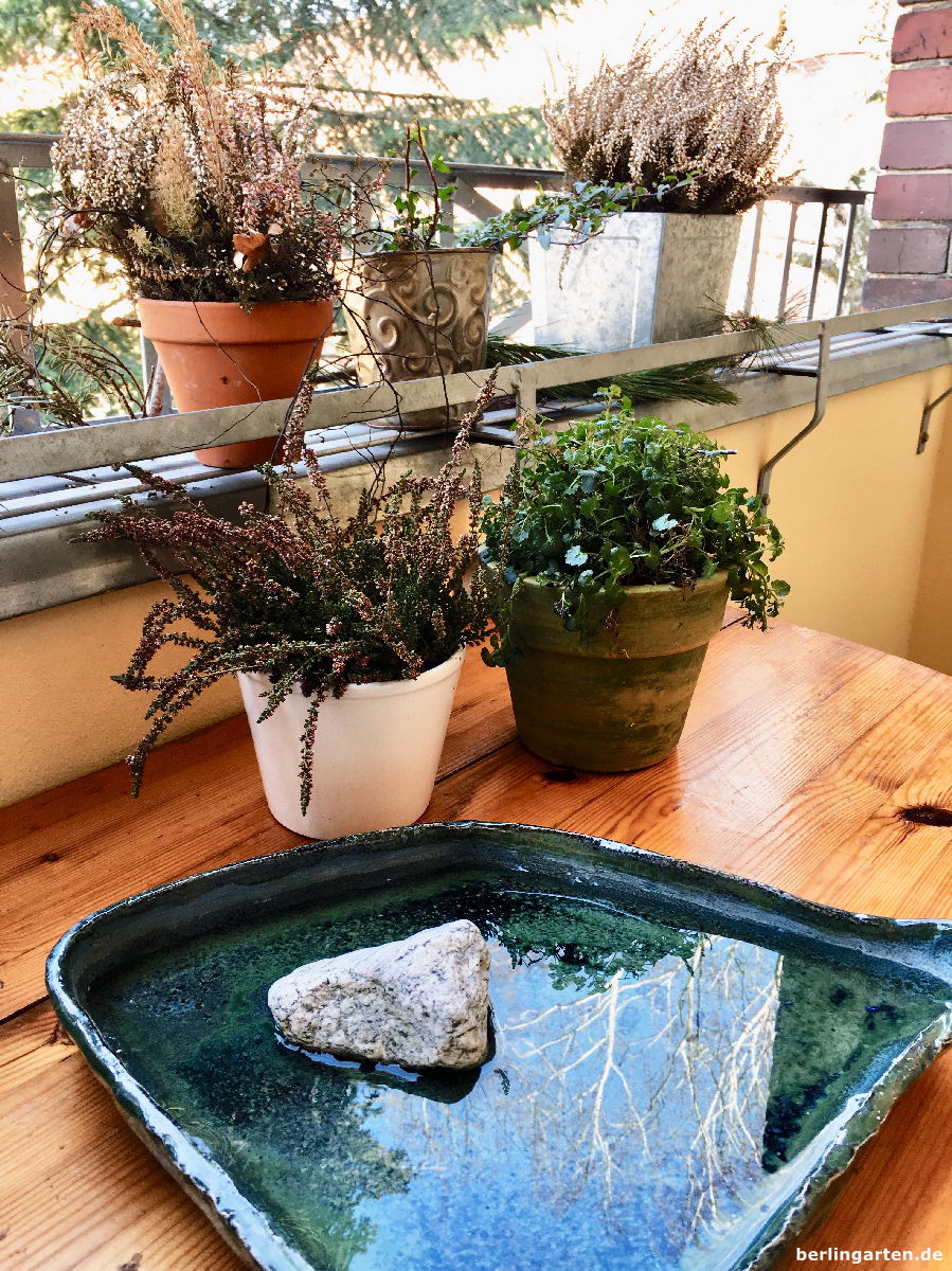 Ein schlechtes Gewissen bekam ich heute, als ich las, dass es Vögel derzeit extrem schwer haben, an Nahrung und vor allem Wasser zu gelangen. Ein kleiner Vogel in der Größe einer Meise verbrennt in einer einzigen Frostnacht bis zu 20 Prozent seines Körpergewichts. Das heißt, wir können füttern helfen, damit er die Verluste leichter wieder ausgleichen kann. Aber vor allem brauchen Vögel jetzt eine Schale mit Wasser, da die natürlichen Wasserquellen zugefroren sind und es, zumindest in Berlin, extrem trocken ist – rät die Deutsche Wildtier Stiftung. Ich habe gleich eine Schale aufgestellt und drei Zentimeter hoch Wasser eingefüllt. Als Landeplatz kam ein flacher Stein in die Mitte. Trotz der Nullgrade im zweistelligen Bereich musste ich erst nach sieben Stunden die oberste gefrorene Schicht abnehmen und neues Wasser nachgießen. Als Alternative hatte Instagram-Freundin Gartenbetti den Tipp, die Schale auf ein Stövchen zu stellen. Den Aufwand, inklusive täglicher Reinigung, sind mir die kleinen Piepmätze allemal wert. Vor allem wird es ja nicht ewig so gehen – für die nächste Woche sind wieder Temperaturen deutlich über dem Gefrierpunkt angesagt.